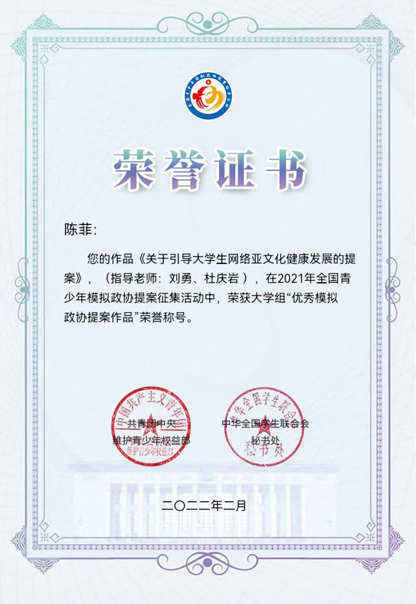 近日,2021年全国青少年模拟政协提案征集活动评选结果揭晓,万象城官网口腔医学系陈菲同学提交的《关于引导大学生网络亚文化健康发展》的提案在全国1447件模拟提案作品中脱颖而出,获评大学组“优秀模拟政协提案作品”。