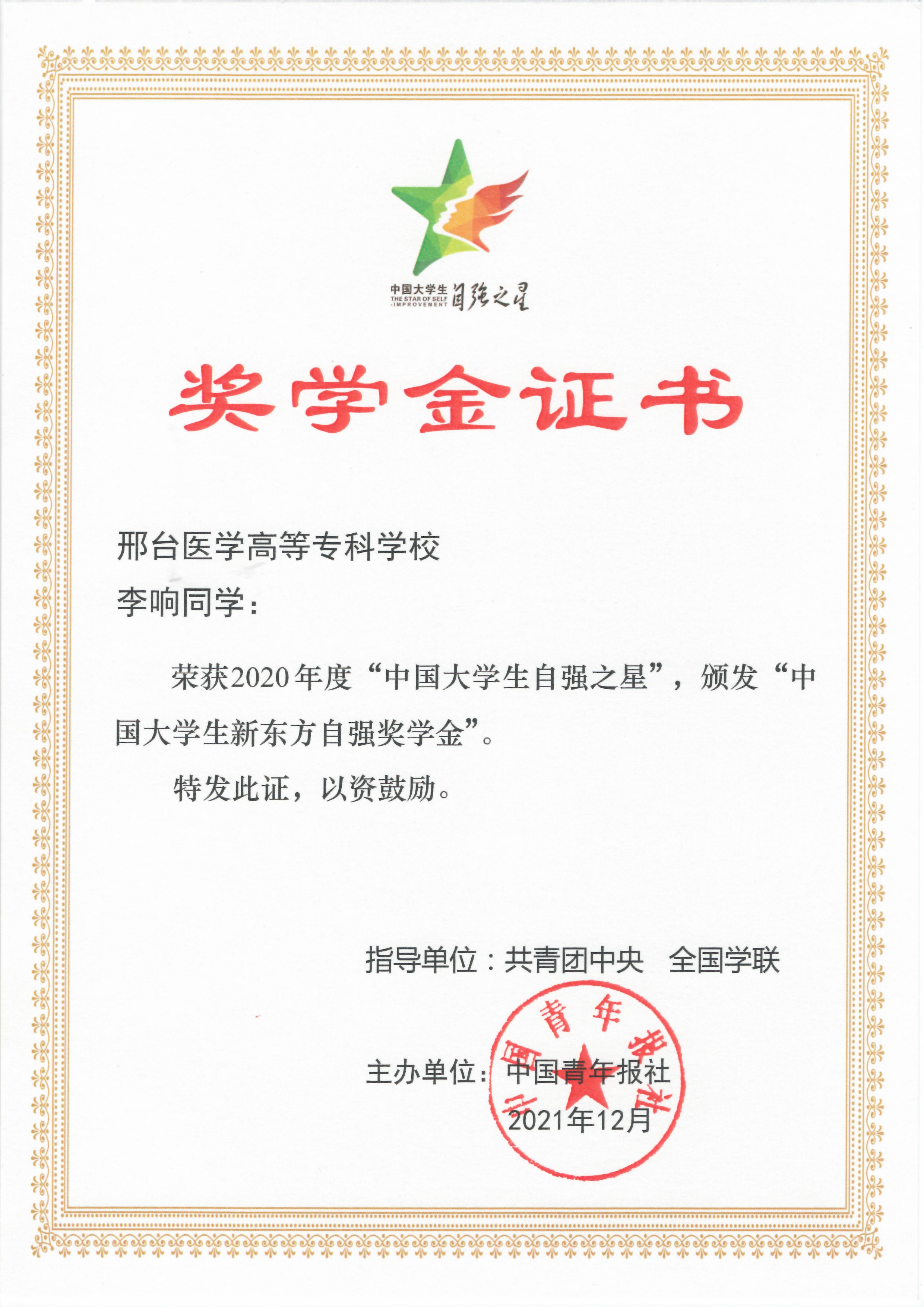 近日,由共青团中央、全国学联、中国青年报社、新东方教育科技集团联合开展的以“青春自强 奋勇争先”为主题的2020年度“中国大学生自强之星”活动获奖结果揭晓。万象城官网2019级药学系眼视光技术班的李响同学荣获“中国大学生自强之星”称号,并获得“中国大学生新东方自强奖学金”2000元。