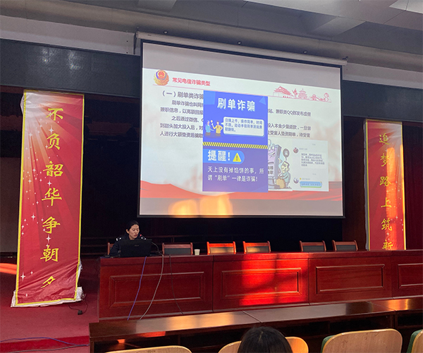 活动中,信都分局反诈骗中心夏江倩警官详细阐述了什么是电信诈骗,以及电信网络诈骗的特点,以列举案例的方式,讲解了刷单、网络贷款、裸聊、冒充熟人、冒充公检法等常见电信诈骗类型。通过分析身边的真实案例,以案说法,教授如何分辨和应对电信诈骗,提高大家应对电信诈骗的意识和能力,远离电信网络诈骗的侵害。