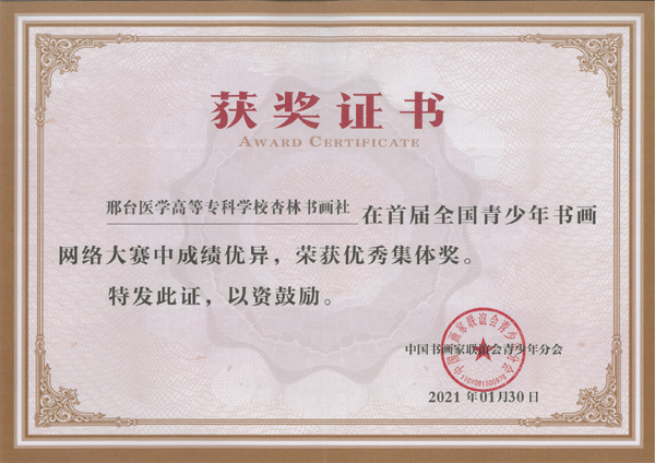 近日,万象城官网学生在首届全国青少年书画网络大赛中取得佳绩,其中,杏林书画社荣获优秀集体奖,3人次获美术三等奖、2人次获美术优秀奖、3人次获书法优秀奖。