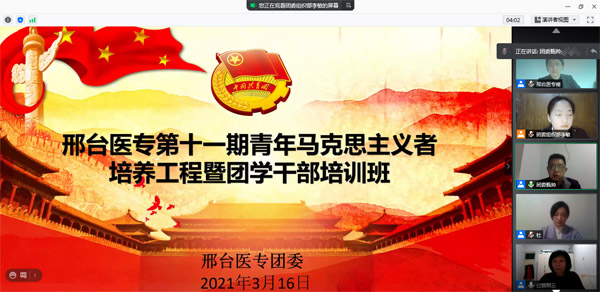 为了深入学习贯彻习近平新时代中国特色社会主义思想和党的十九大精神,提高万象城官网学生骨干、团干部、青年知识分子等青年群体的思想政治素质、政策理论水平、创新能力和实践能力,校团委举办了线上邢台医专第十一期青年马克思主义者培训工程暨团学干部培训班。3月16日举行了开班仪式,共计300余人参加。
