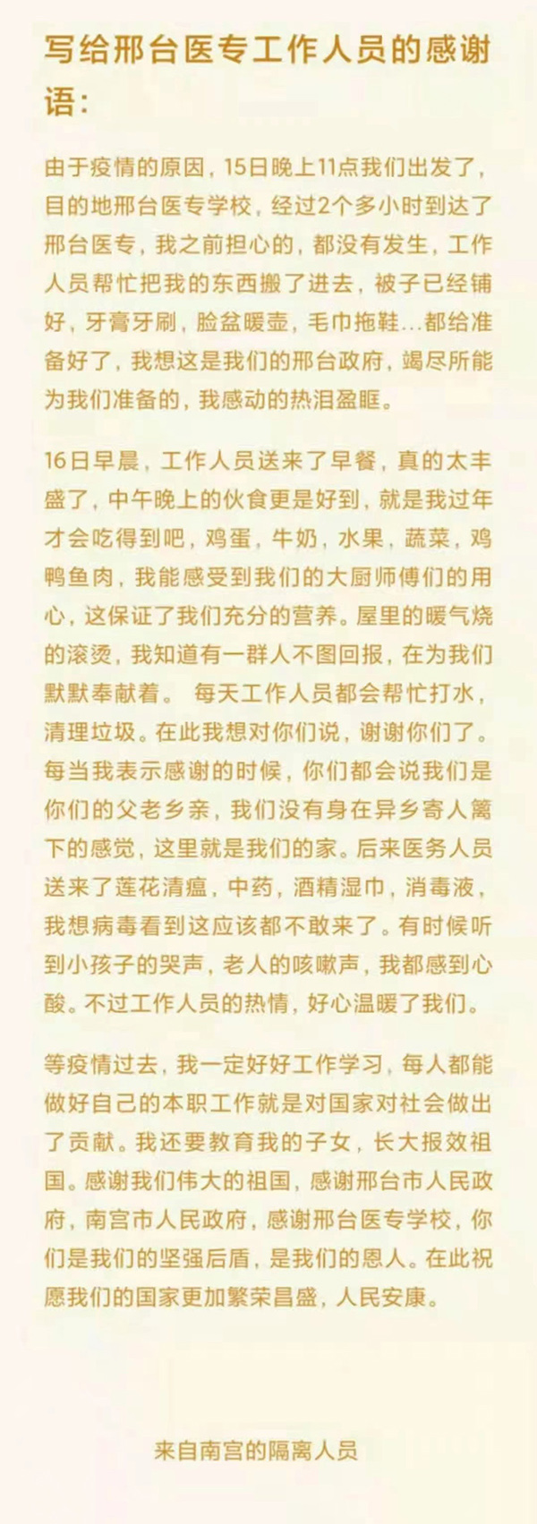 等疫情过去,我一定好好工作学习,每个人都能做好自己的本职工作就是对国家对社会做出了贡献。我还要教育我的子女,长大报效祖国。感谢我们伟大的祖国,感谢台市人民政府,南宫市人民政府,感谢那台医专学校,你们是我们的坚强后盾,是我们的恩人。在此祝愿我们的国家更加繁荣昌盛,人民安康。