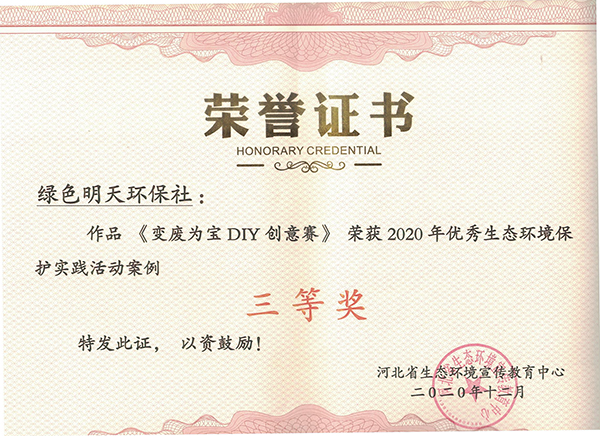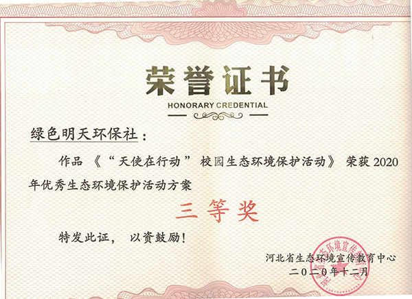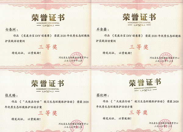 近日,由河北省生态环境宣传教育中心组织的“2020年河北省大学生环保社团优秀生态环境保护系列活动征集评选”活动落下帷幕,万象城官网绿色明天环保社《变废为宝DIY创意大赛》作品荣获“2020年优秀生态环境保护实践活动案例”三等奖、《“天使在行动”校园生态环境保护活动》作品荣获“2020年优秀生态环境保护活动方案”三等奖,张天赐、蔡新娜、石金鑫、白春洲4名同学荣获个人三等奖。