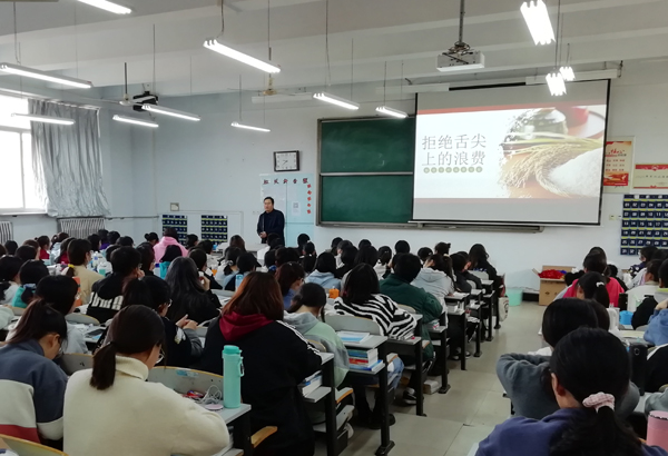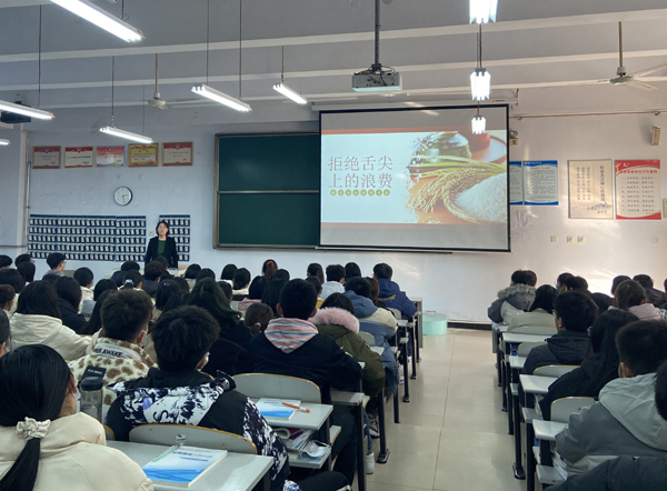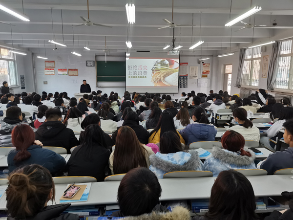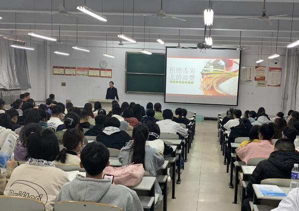 在2020级口技班和中药1班,郑书深校长结合自身学术研究与专业领域知识,以“舌的概念”和“舌诊的重要性”导入,围绕“什么是崇俭精神”、“为什么要弘扬崇俭精神”、“怎么在实际行动中弘扬崇俭精神”三个方面讲解了“拒绝舌尖上的浪费”。郑校长从崇俭是后疫情时代的现实要求、是中华优秀传统文化的传承、是中国共产党的制胜法宝、体现了马克思主义的哲学智慧四个方面强调了崇俭的重要性,并提议大家“行动起来,杜绝舌尖上的浪费”。