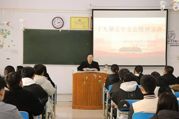 11月27日下午,学校党委书记田德荣到护理系宣讲党的十九届五中全会精神。护理系全体行政人员、专兼职辅导员和学生代表100余人参加。宣讲会由护理系党总支书记李华新主持。