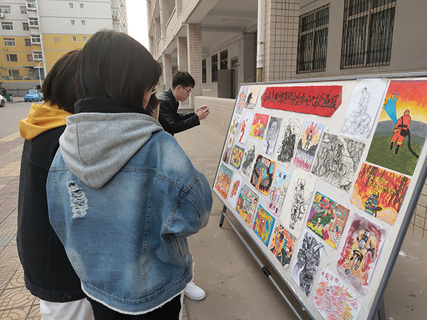 11月10日,“最美逆行者”“我的宿舍我的家”“安全重于泰山”等校园消防安全主题的绘画展在教学楼前展出,参赛选手以素描、水粉、铅笔画等描绘手法,讴歌了消防战士大无畏的牺牲精神,警示着每一名驻足观看者要时刻注意用电用火安全,从我做起,关心消防,珍爱生命。
