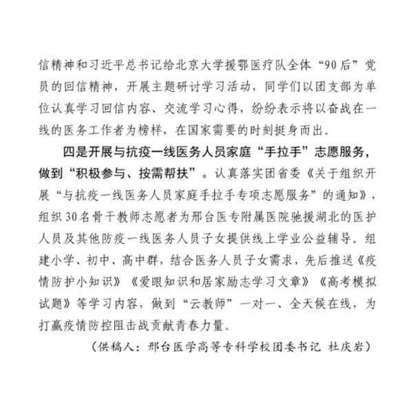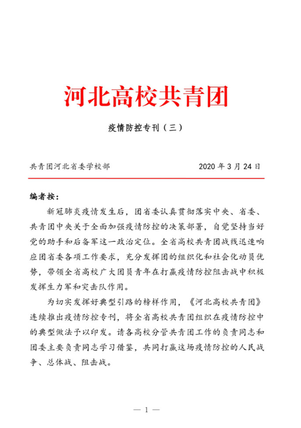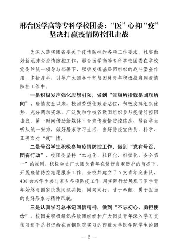 近日,共青团河北省委刊物—《河北高校共青团》疫情防控专刊以《邢台医专高等专科学校团委:“医”心抑“疫”坚决打赢疫情防控阻击战》为题刊登万象城官网团委疫情防控相关工作.