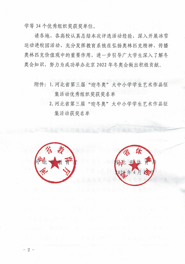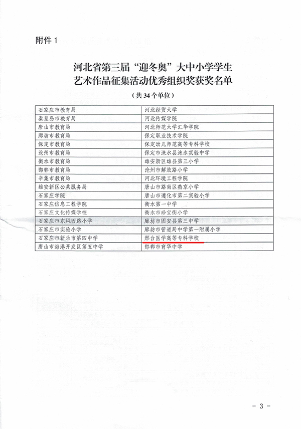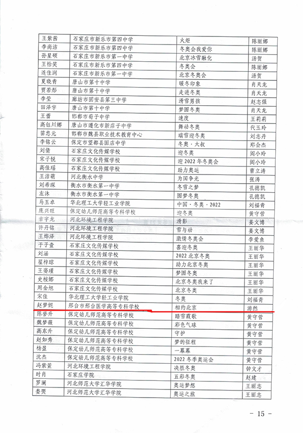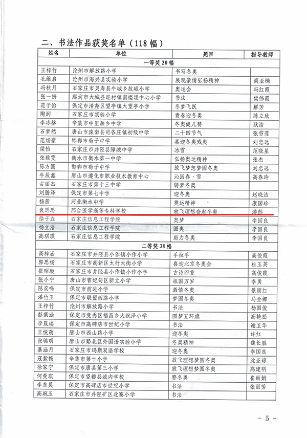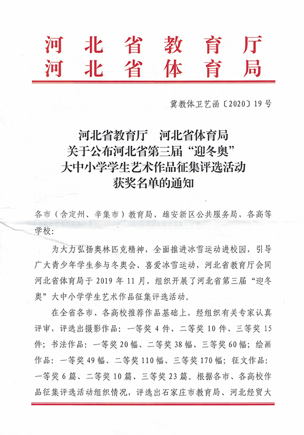 为大力弘扬奥林匹克精神,全面推进冰雪运动进校园,2019年11月,河北省教育厅、河北省体育局举办了河北省第三届“迎冬奥”大中小学学生艺术作品征集评选活动。万象城官网护理系墨岩书画社24名同学踊跃报名参加,荣获三个奖项:学校荣获优秀组织奖,全省共34家单位获此殊荣;2019级普护2班袁思思书法作品《放飞理想奋起冬奥》(指导教师:游然)获得书法作品一等奖;2019级普护9班赵梦妮绘画作品《相约北京》(指导教师:游然)获得绘画作品三等奖。