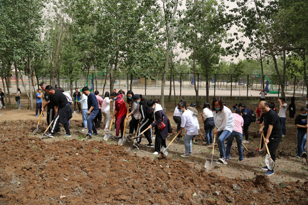 活动当日,学校领导田德荣、郑书深、杜成旭带领大家手持铁锹、铁镐对天使湖周围、小树林进行环境清理、掘地松土。铁锹在握,锄头在手,有的掘地,有的松土,有的搬运翻出的石块、砖块,有的清理枯树、枯枝……大家干的如火如荼。在明媚的阳光下,大家汗流浃背,有的脱下外套,有的卷起衣袖,干劲十足。