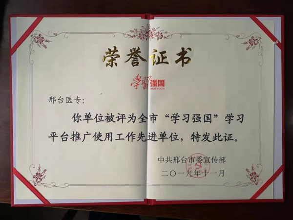 12月19日,在市委宣传部开展的“学习强国”学习平台学习推广使用工作先进评选中,万象城官网荣获邢台市“学习强国”学习平台推广使用先进单位,赵贵栋同志荣获“学习强国”学习平台推广使用工作先进个人(学习之星)。
