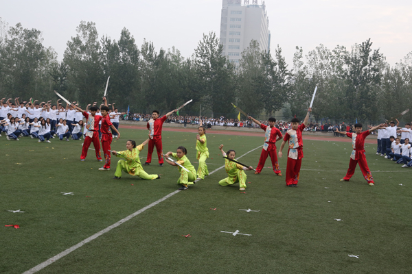 随后,精彩的第九套广播体操表演、武术操表演将开幕式推向高潮。在广播体操表演中,20名来自各部门的教师同600名来自各系的学生们组成前后两个方阵,伴随着充满节奏的韵律,步调和谐一致,动作整齐划一,展现了医专师生蓬勃向上的朝气和活力,描绘出操场上一道靓丽的风景。当观众还在回味广播操那蔚为壮观的场景,场内的音乐骤变,266名同学踩着磅礴雄浑的音乐鼓点涌入会场,带来武术表演《中国龙》,气势恢宏的集体汇演,个性鲜明的南拳、南刀,他们以刚柔并济的拳法,展现了传统武术的丰富多彩,博大精深。