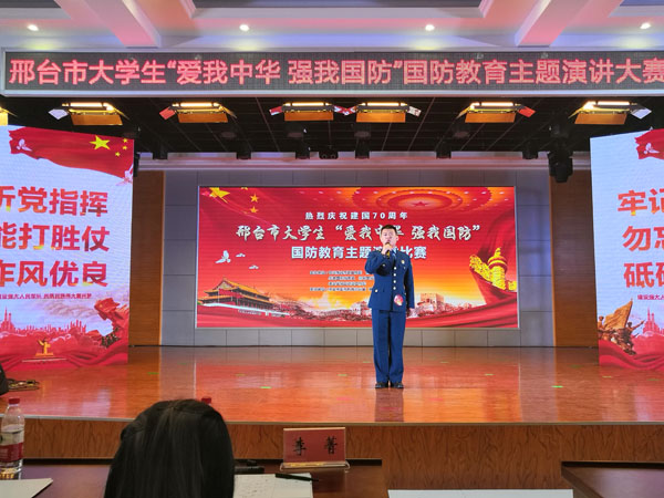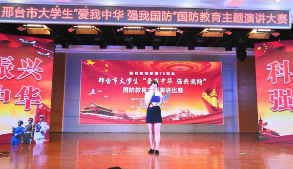 为深入贯彻落实党的十九大精神,扎实开展高校国防教育工作,5月30日,由中共邢台市委宣传部、邢台市教育局、共青团邢台市委、邢台军分区动员处和邢台军分区政治工作处共同主办的庆祝新中国成立70周年邢台市大学生“爱我中华•强我国防”主题演讲比赛在邢台市特殊学校礼堂举行。经过校内选拔,万象城官网选派6组选手、共12名同学参赛。