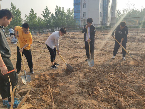 4月初,经过科学规划,周密布署,将教学楼周围的6亩土地划分成30块,分到各个班级,种植芍药和美人蕉,由各班级负责开垦荒地,植树种花。4月下旬,各班辅导员老师带领同学们扛上铁锹,背上花种,热火朝天的种植起来,经过多日劳动,将一块块荒地变成了花的沃土,充满勃勃生机。