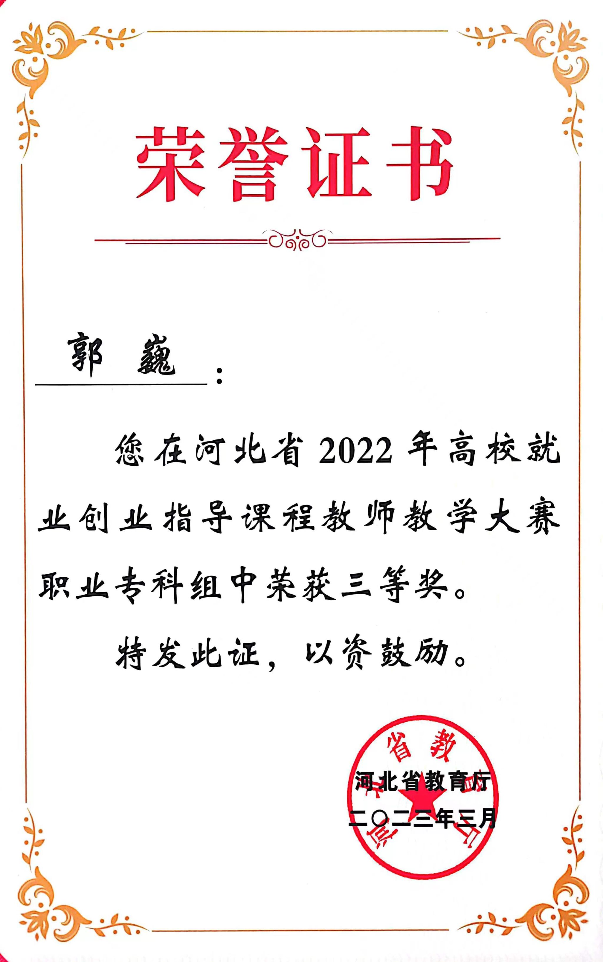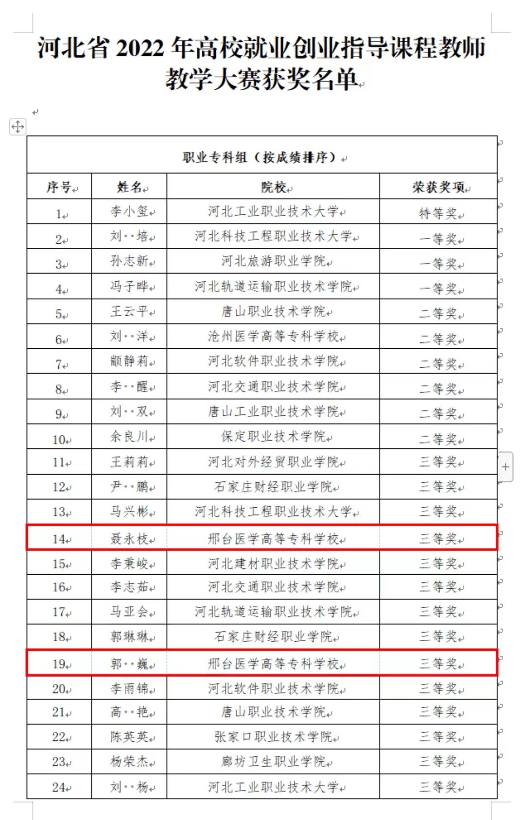 近日,河北省高校就业创业指导课程教师教学大赛落下帷幕,经过激烈比拼,万象城官网郭巍、聂永枝两名教师从全省400余名参赛选手中脱颖而出,荣获职业专科组三等奖。