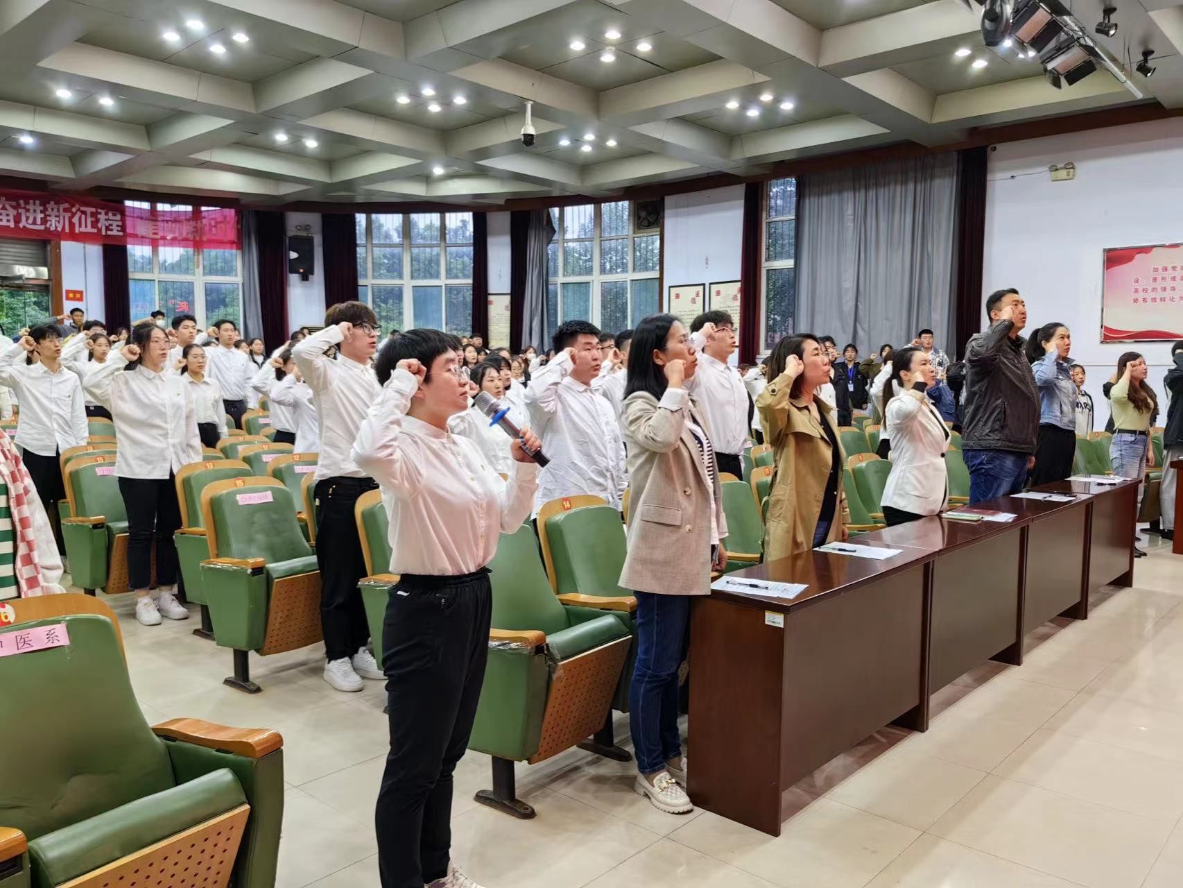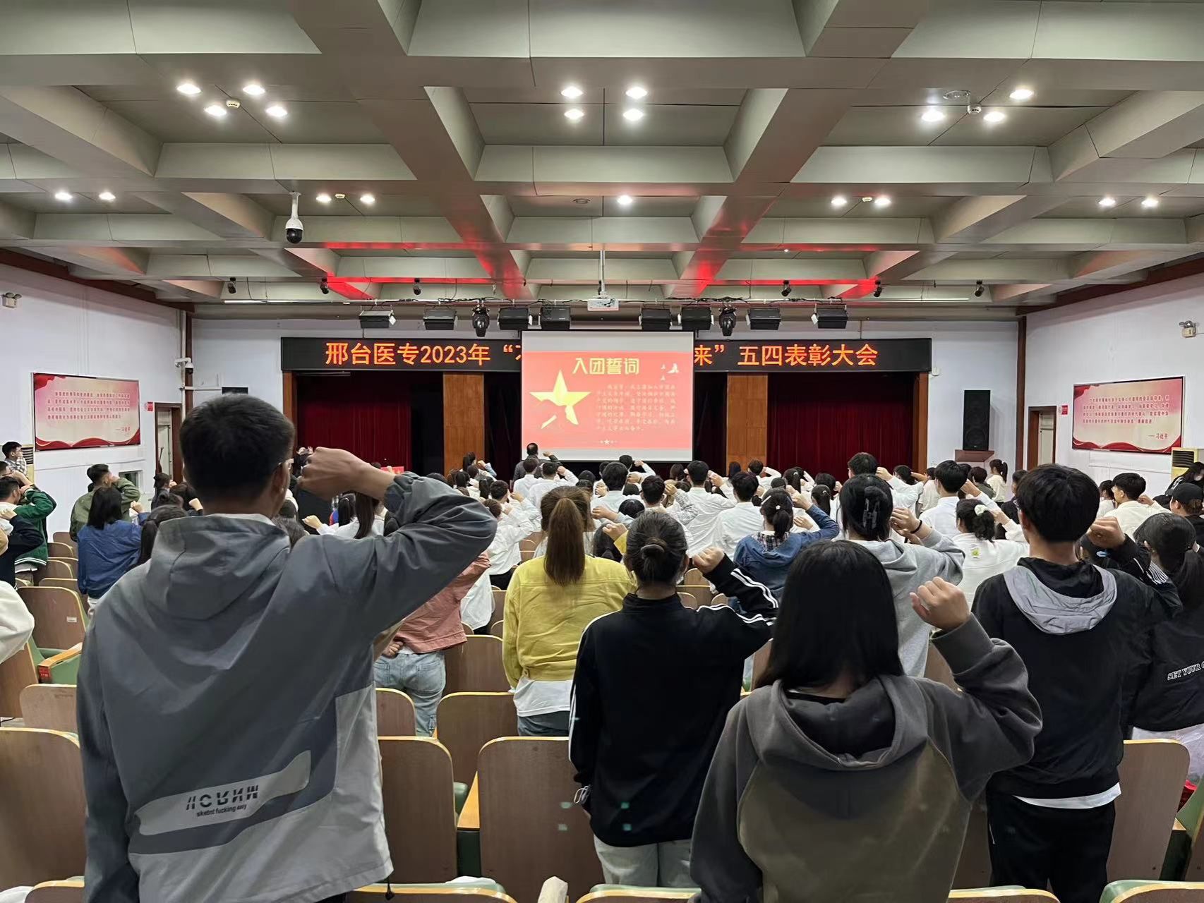 随后,与会人员高举右手,紧握右拳,在领誓人的带领下重温入团誓词,一句句誓词铿锵有力,朝气蓬勃,展现医专青年师生昂扬向上、团结奋进的精神面貌。
