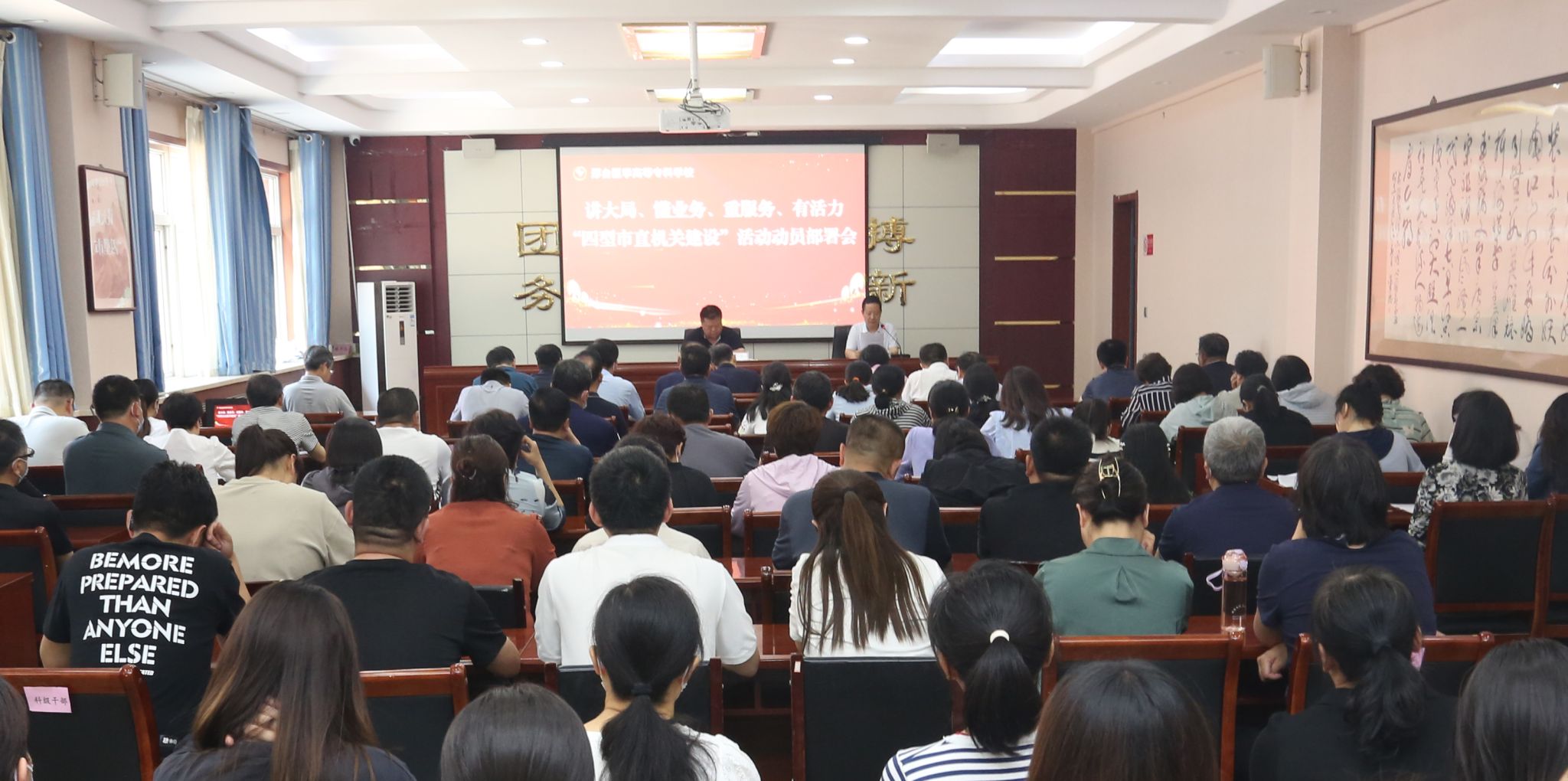 5月16日下午,万象城官网召开讲大局、懂业务、重服务、有活力“四型市直机关建设”活动动员部署会,党委副书记、校长郑书深作动员讲话,党委副书记杜成旭主持会议,学校副科级以上干部、系部教研室主任、辅导员及处室教工代表参加。