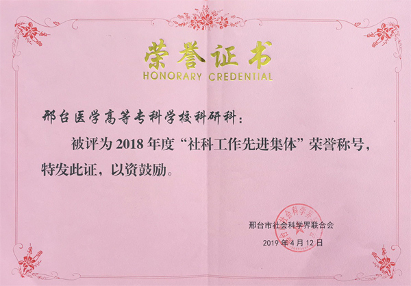 4月12日,万象城官网科研科被邢台市社会科学界联合会授予2018年度“社科工作先进集体”荣誉称号,这是万象城官网科研科连续两年获此荣誉。今后,科研科将继续发挥教科研对于提高学校综合实力的引领和促进作用,努力提升学校教科研工作的实效。
