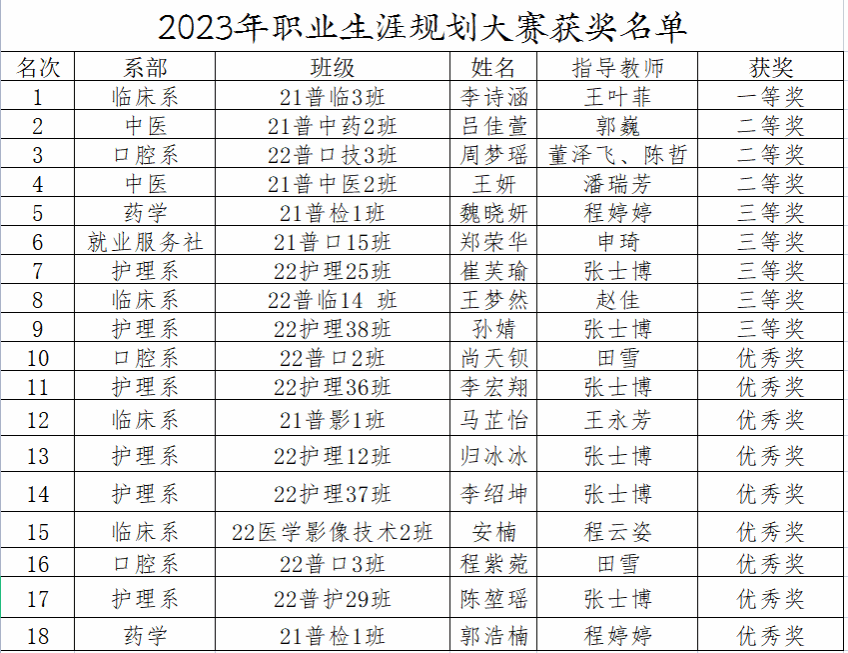 大赛自4月份启动,经初、复赛选拔,18名选手脱颖而出进入决赛。决赛中,各位选手深入剖析自身优劣势,合理规划职业目标,详细制定实施措施。2021级普临3班李诗涵励志成为一名救死扶伤的临床医生,她分析了自身与职业的适配度,围绕如何实现目标愿景,确定了短期、中期、长期三个阶段的奋斗方向和具体措施,努力将人生理想融入国家事业。2022级普口技3班周梦瑶将自己的职业规划同弘扬工匠精神相结合,立志学精学透专业技术,做一名优秀的口腔医生,为医疗卫生事业做更多贡献。选手们激情昂扬的规划分享,充分彰显出万象城官网学子将个人志向融入民族复兴伟业的使命担当。经过激烈角逐,最终评出一等奖1名、二等奖3名、三等奖5名、优秀奖9名。