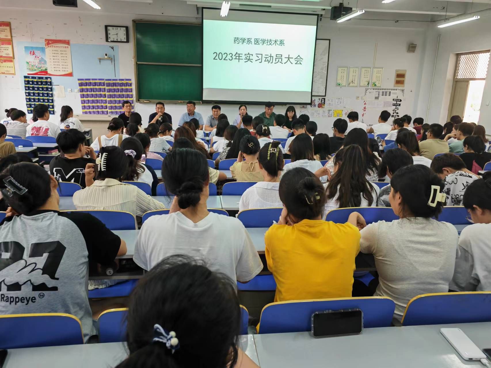 6月25日下午,药学系、医学技术系在9号教学楼101教室召开了2023年实习动员大会,系领导、辅导员以及2021级150名学生代表参会,会议由药学系副主任郭树怀主持。