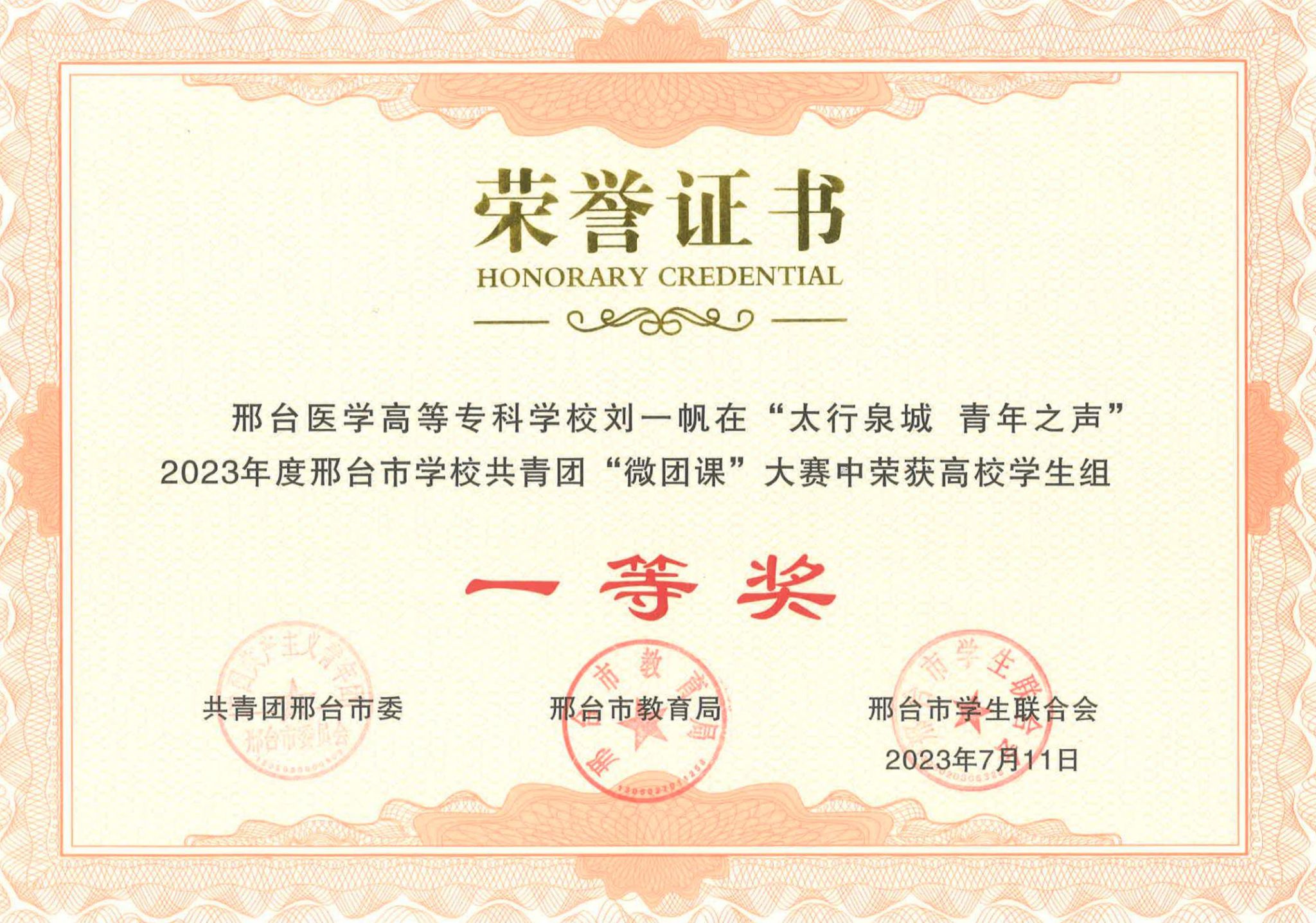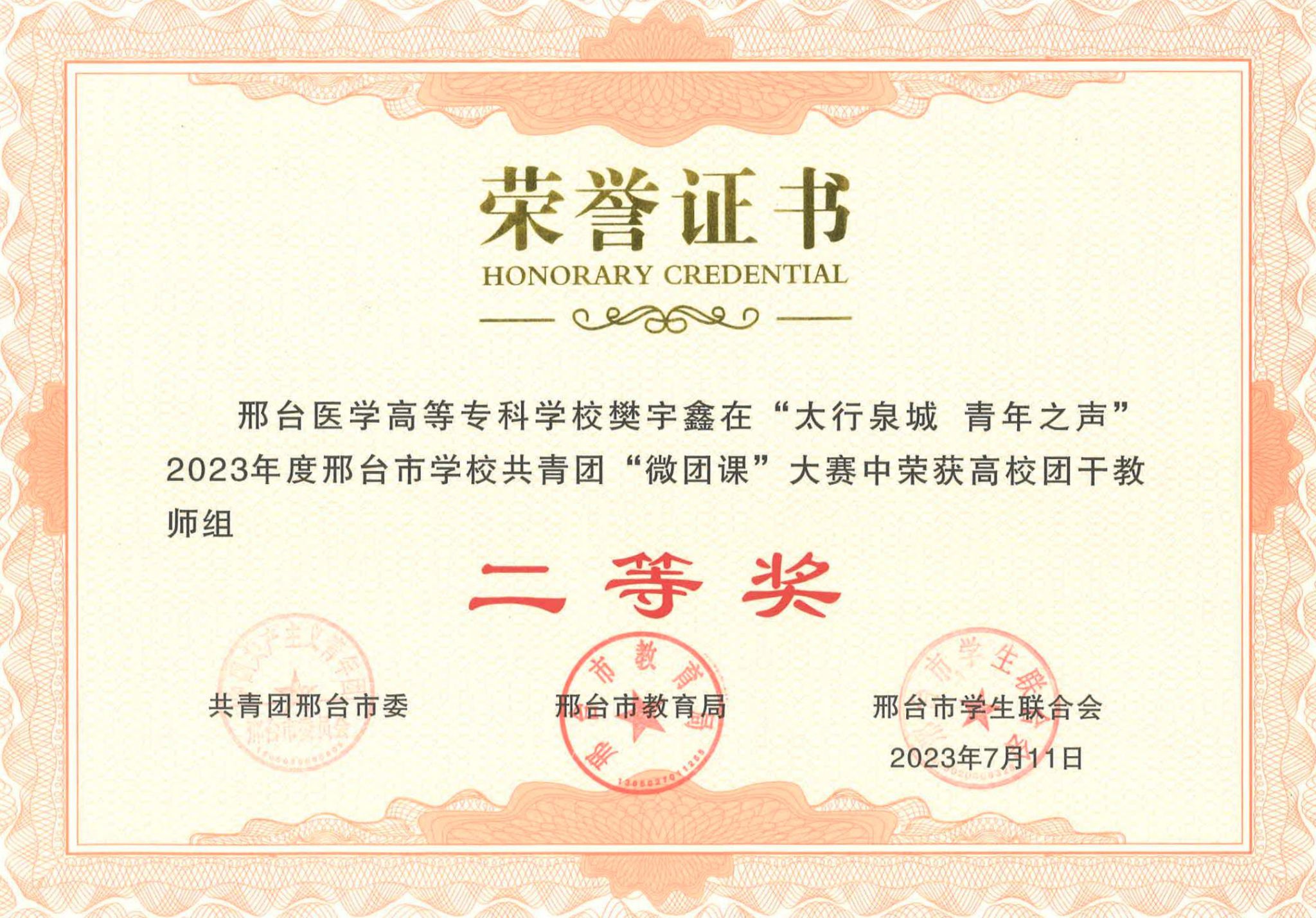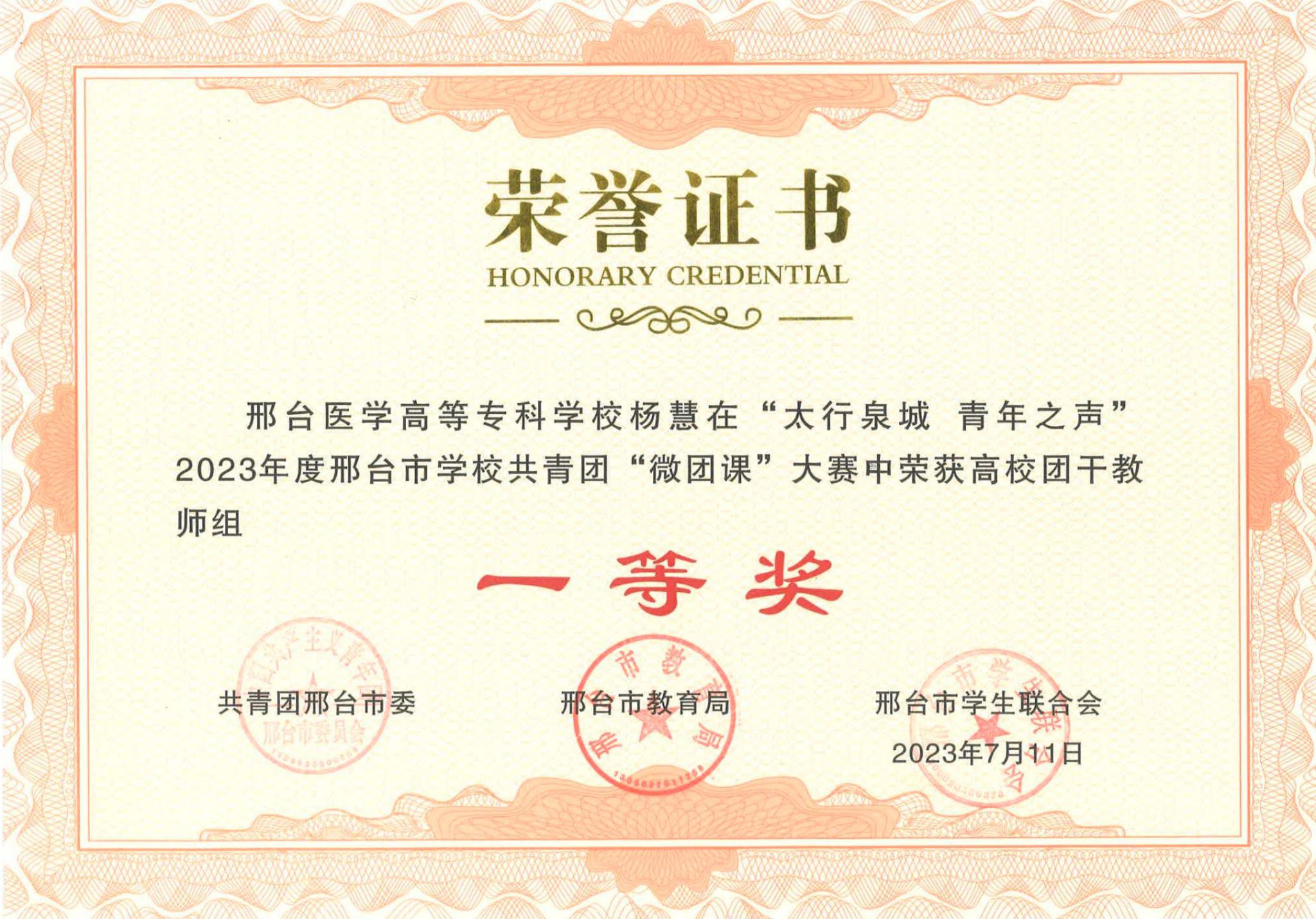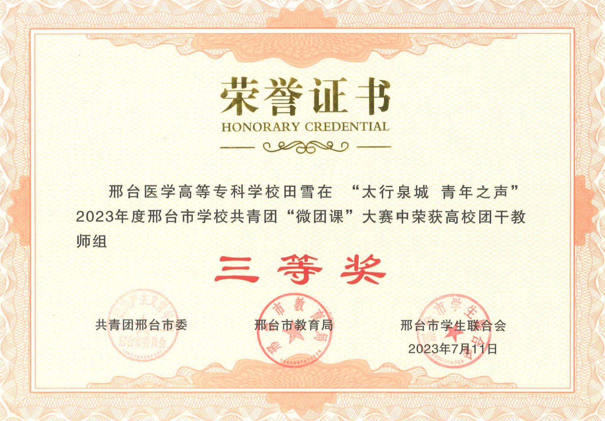 近日,由共青团邢台市委、邢台市教育局、邢台市学生联合会主办的2023年邢台市学校共青团“微团课大赛”成绩揭晓。万象城官网荣获高校团干教师组一等奖1名、二等奖1名、三等奖1名,高校学生组一等奖1名。