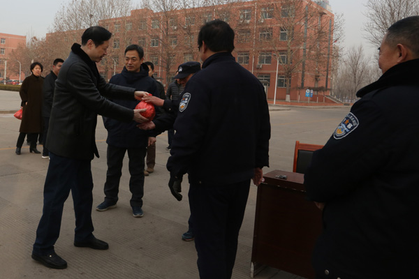 天寒人心暖,祝福寄深情。农历大年三十上午,在新春佳节即将来临之际,学校领导田德荣、李建广、杜成旭、李朝鹏、张志强分别看望了坚守在校本部、南校区、皇寺校区工作岗位上的干部职工,向他们送去节日的祝福和亲切的慰问。