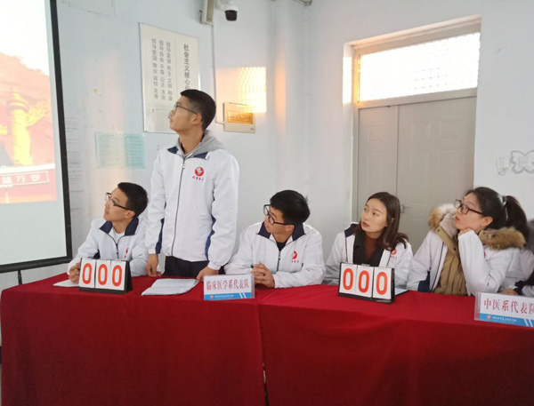 比赛分为必答题和抢答题两个环节,由临床医学系、口腔医学系、中医系、药学系四个代表队参赛。选题以马克思主义中国化最新理论成果、习近平总书记系列重要讲话、党史团史、党的十九大报告为主要内容。第一环节为必答题,答题顺序现场抽签决定,各组选手沉着冷静,自信作答,记分牌不断刷新。第二环节为抢答题,各小组不甘示弱,选手精神高度集中,胸有成竹积极抢答,赛场气氛十分热烈。经过两个环节的比赛,药学系代表队荣获比赛第一名,比赛在《共青团之歌》的视频中落下帷幕。