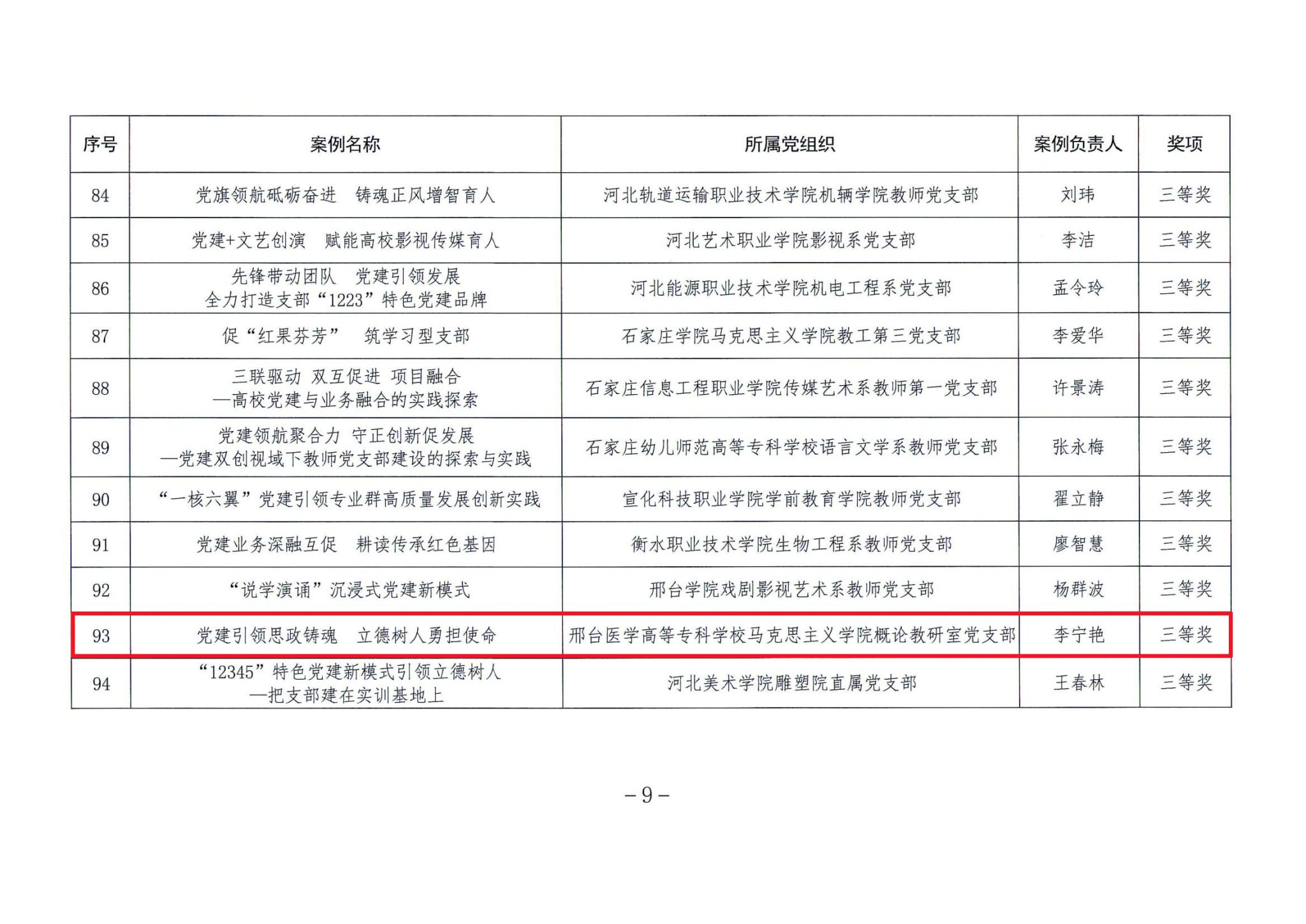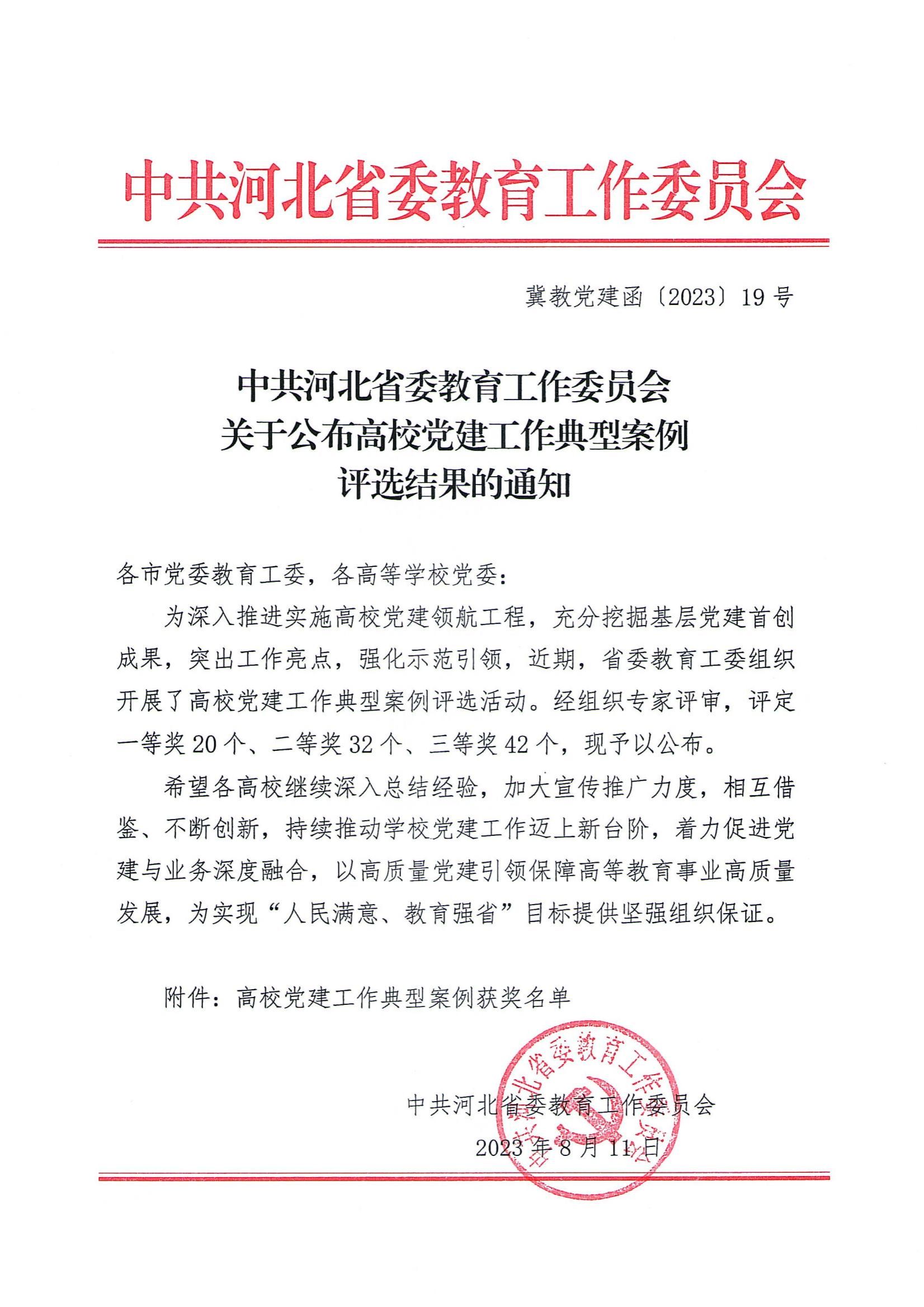 近日,中共河北省委教育工作委员会印发《关于公布高校党建工作典型案例评选结果的通知》,公布了高校党建工作典型案例评选结果,由组织宣传统战部组织推荐,马克思主义学院概论教研室主任李宁艳负责的《党建引领思政铸魂 立德树人勇担使命》党建工作典型案例荣获三等奖。
