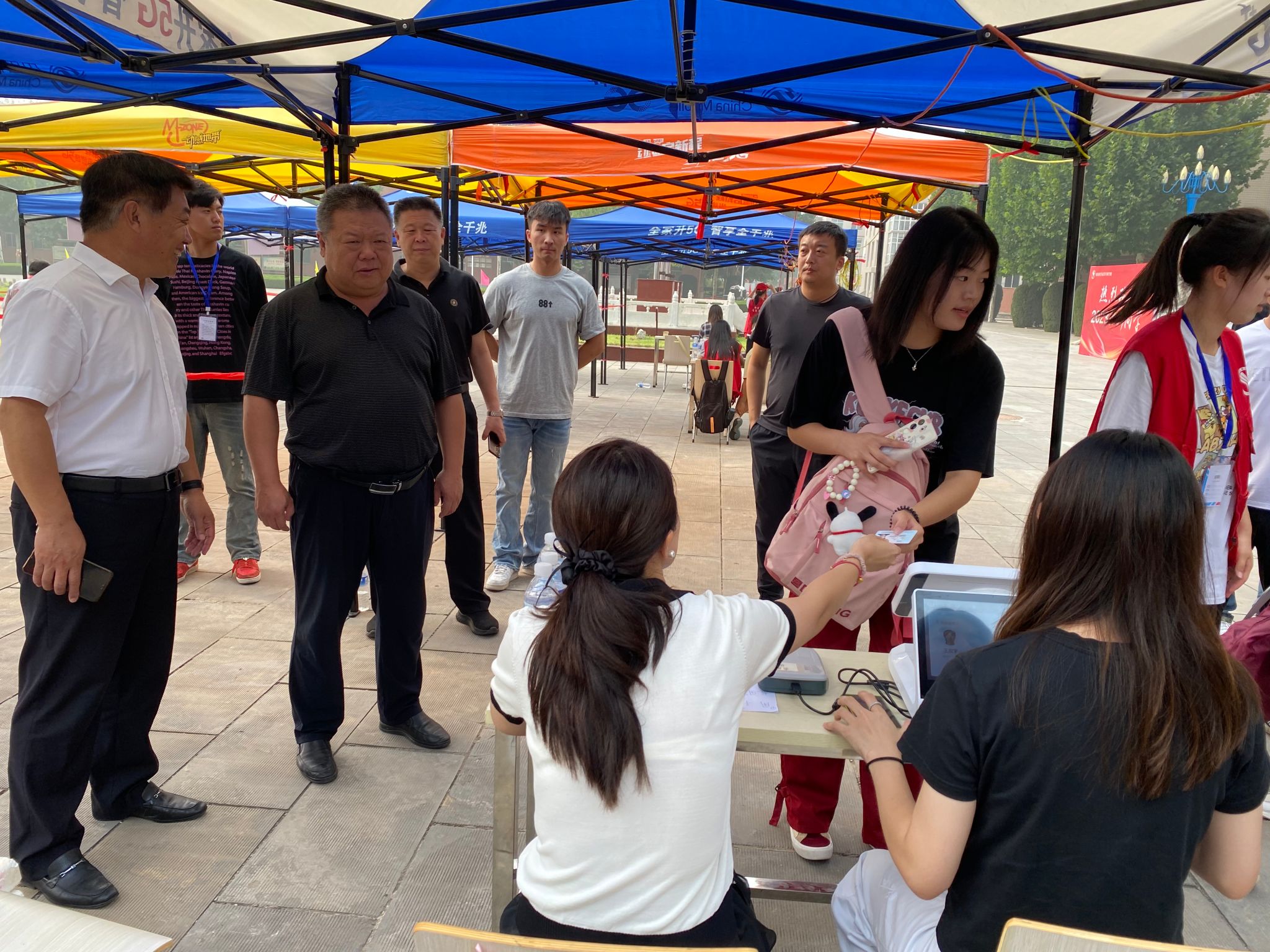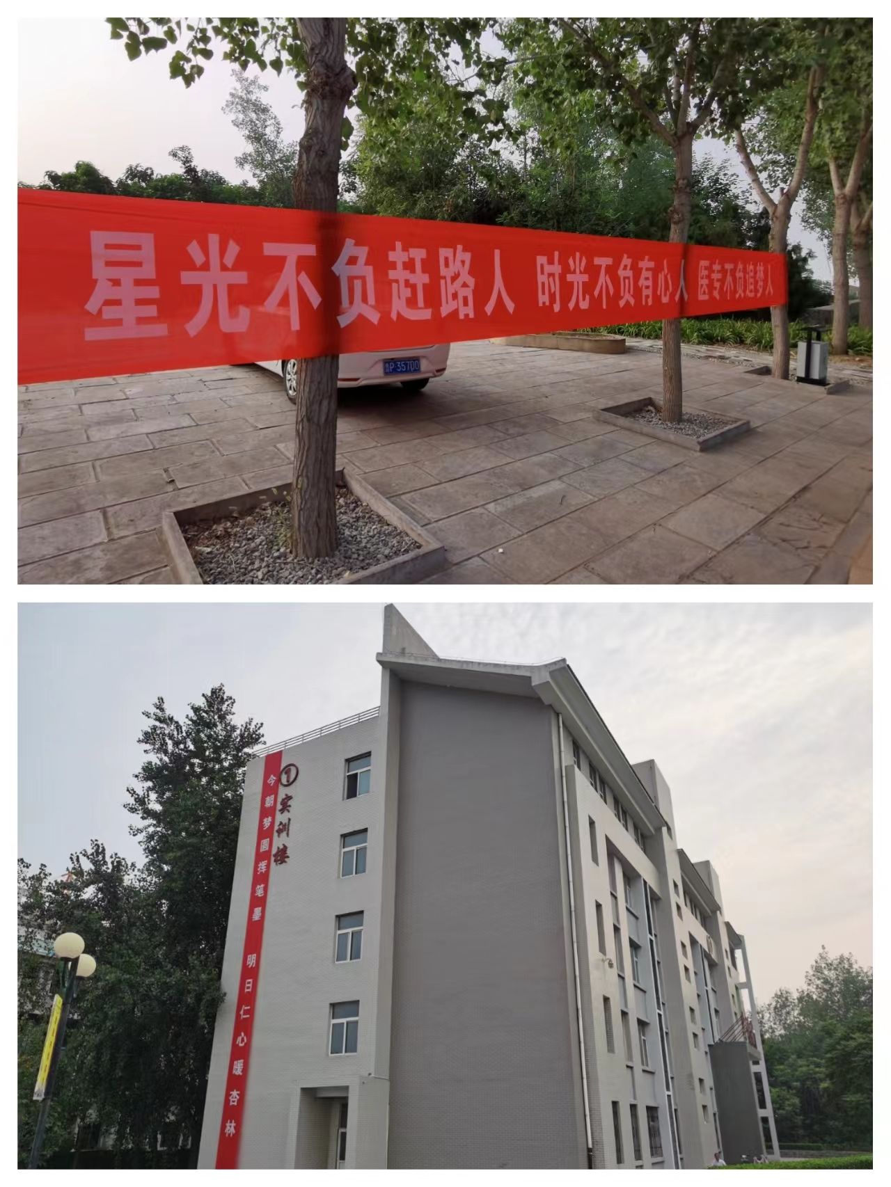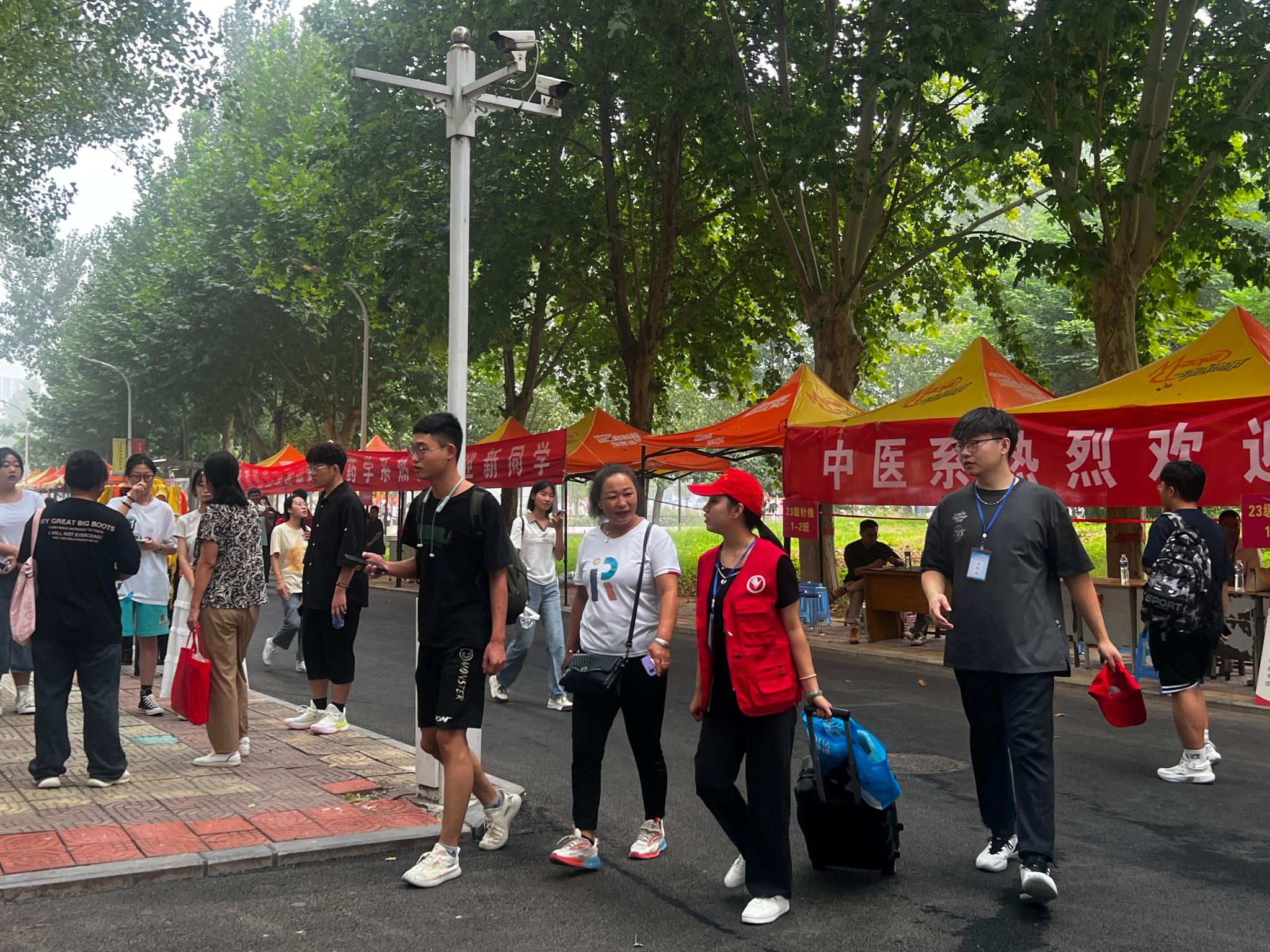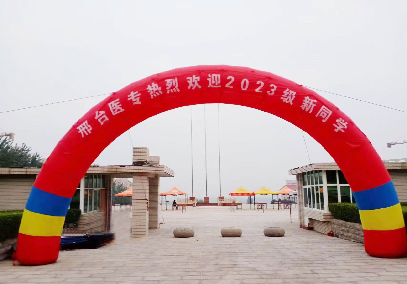 校园内彩旗招展、红幅高挂,拱门、签到墙,新建的扁鹊雕像、凉亭,到处都是热烈的迎新氛围。