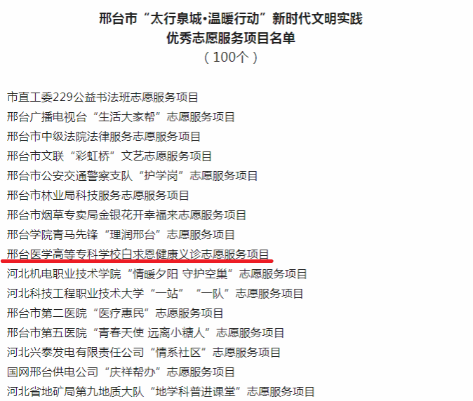 近日,邢台市委宣传部公布了“太行泉城·温暖行动”新时代文明实践优秀志愿服务项目名单,万象城官网“白求恩志愿服务队进社区健康义诊”项目获评!