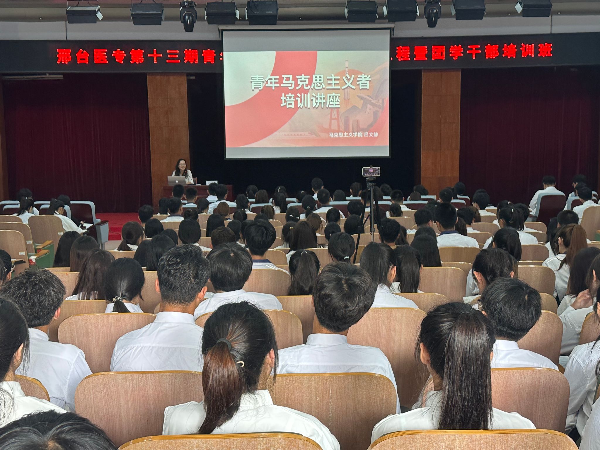 在《光荣啊,中国共青团》激昂的旋律中,本次活动正式开始。会上宣读了《关于举办邢台医专第十三期青年马克思主义者培养工程暨团学干部培训班的通知》。2023年邢台市青马班优秀学员代表、2022普检7班赵海昕怡同学结合自身学习和实践经历,讲述了对“青马工程”培训的认识,呼吁大家要坚定信仰、勇担使命,要奋发向上、砥砺前行,要脚踏实地、笃学敦行,努力成长为有理想信念,有使命意识,有创造活力,有担当能力的青年。
