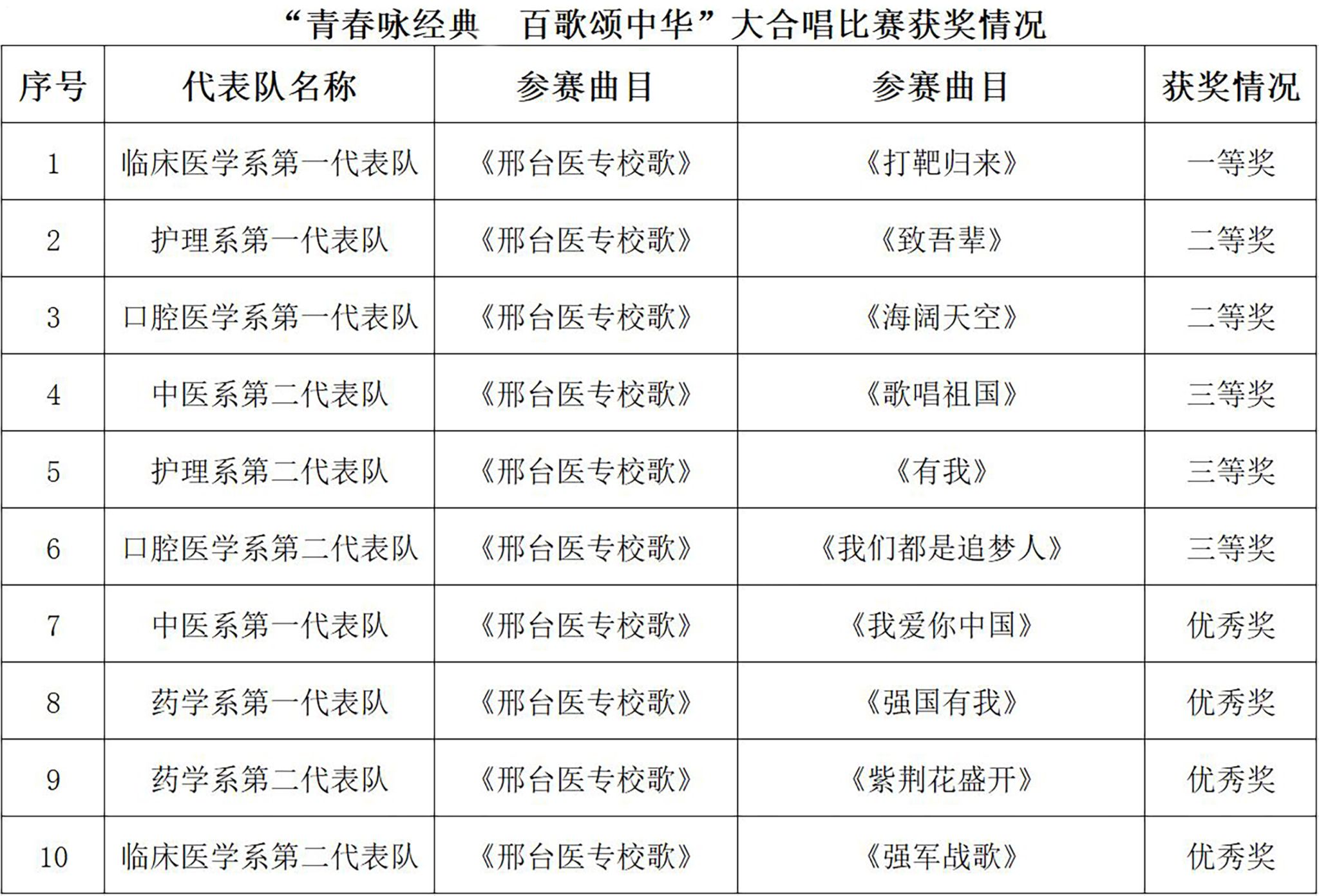 在雄壮有力的《强军战歌》中,“青春咏经典 百歌颂中华”大合唱比赛决赛正式开始。经选拔,共10支代表队入围此次决赛,各代表队分别演唱了必选曲目《邢台医专校歌》和一首自选“红歌”,同学们统一的着装,嘹亮的歌声,充分展现了万象城官网青年学子昂扬向上的精神面貌。经过激烈角逐,最终临床医学系第一代表队摘得桂冠。