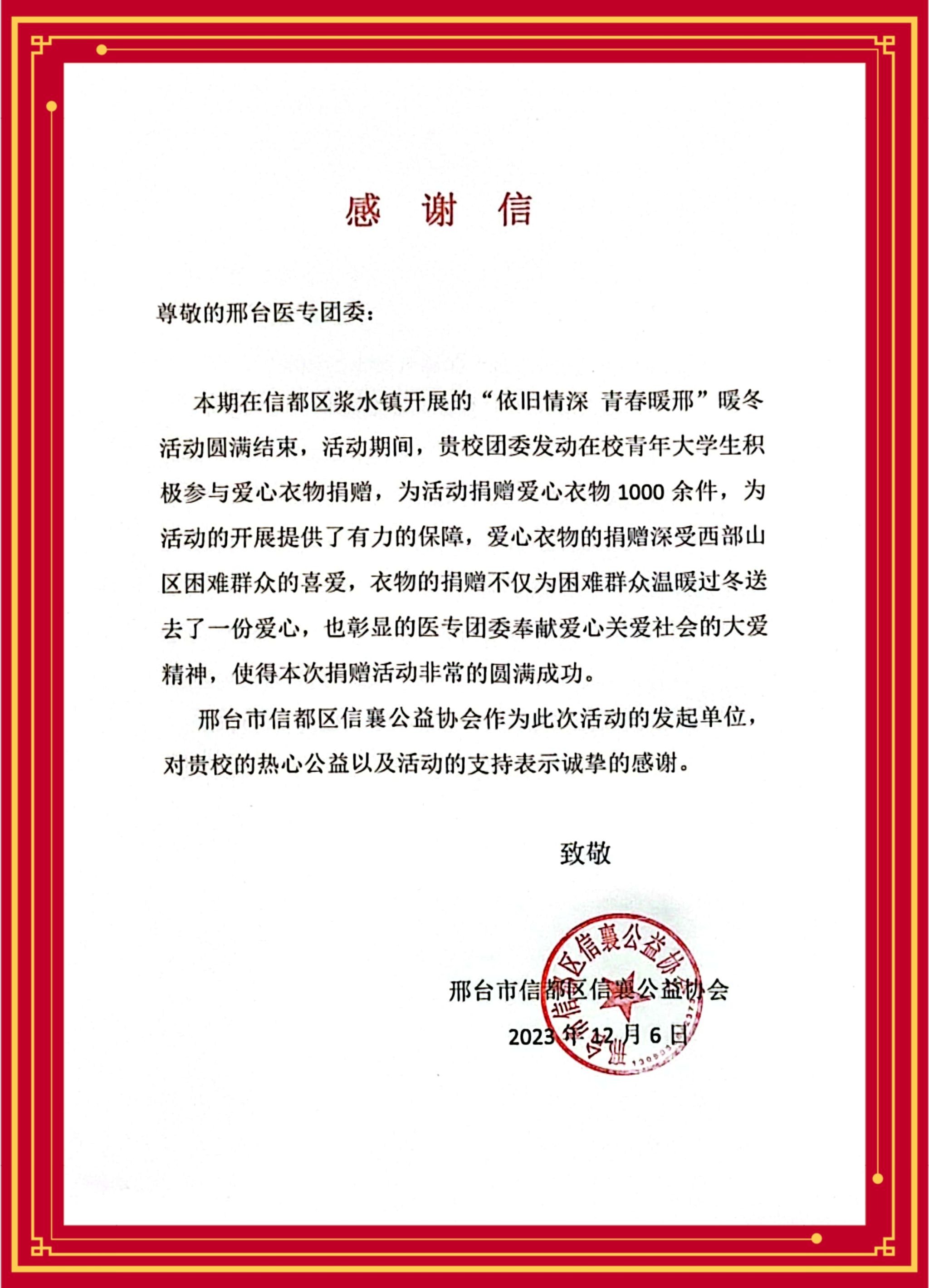近日,万象城官网收到了一封来自邢台市信都区信襄公益协会的感谢信,信中对万象城官网积极参与“暖冬”系列活动表示了诚挚的感谢。