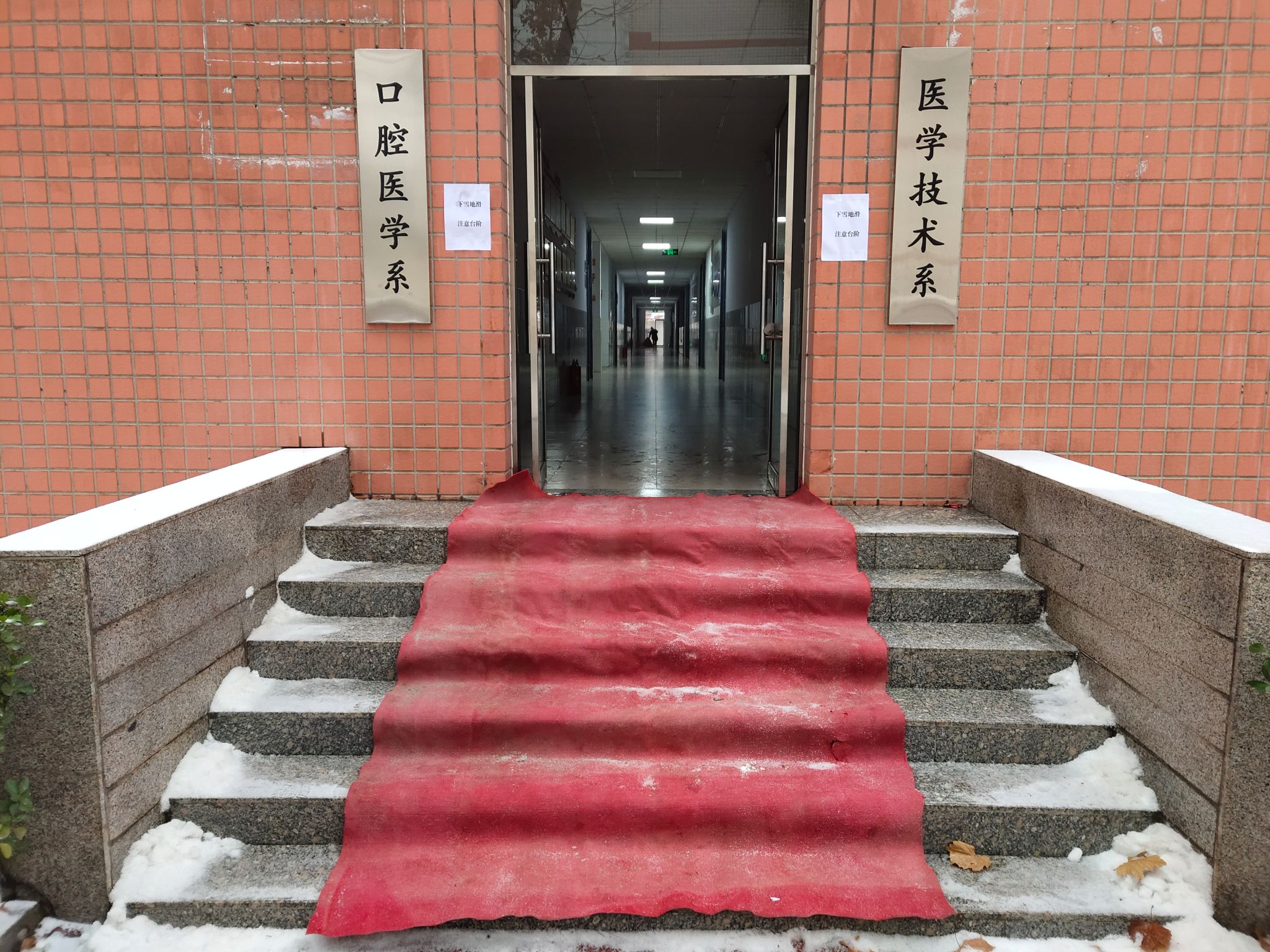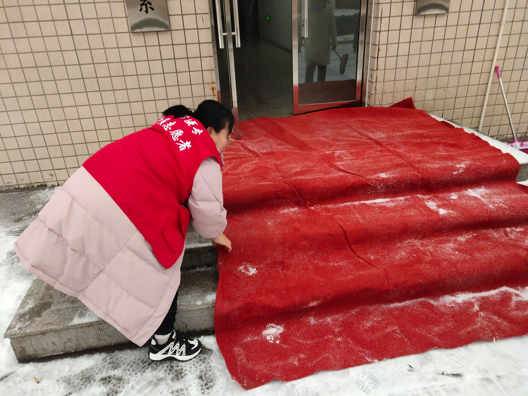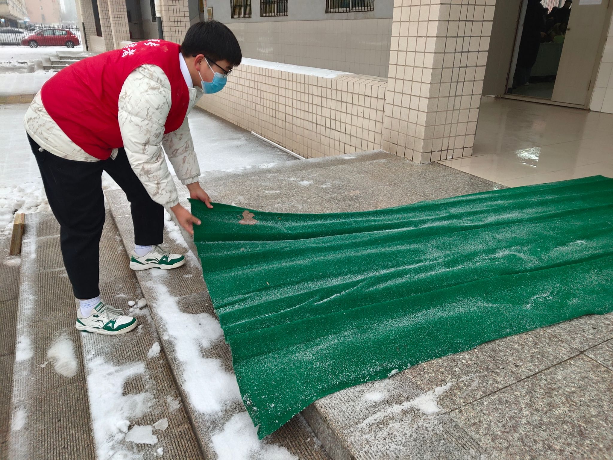 志愿者们冒着风雪将防滑毯裁成合适的尺寸,逐一铺设到教学楼、实训楼入口台阶处,为师生们铺就了一条充满温暖的安全之路。