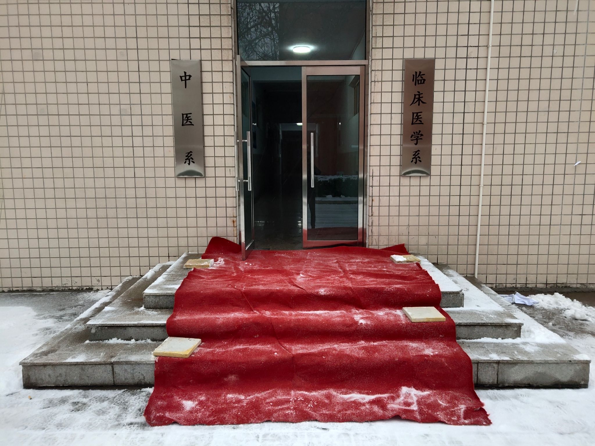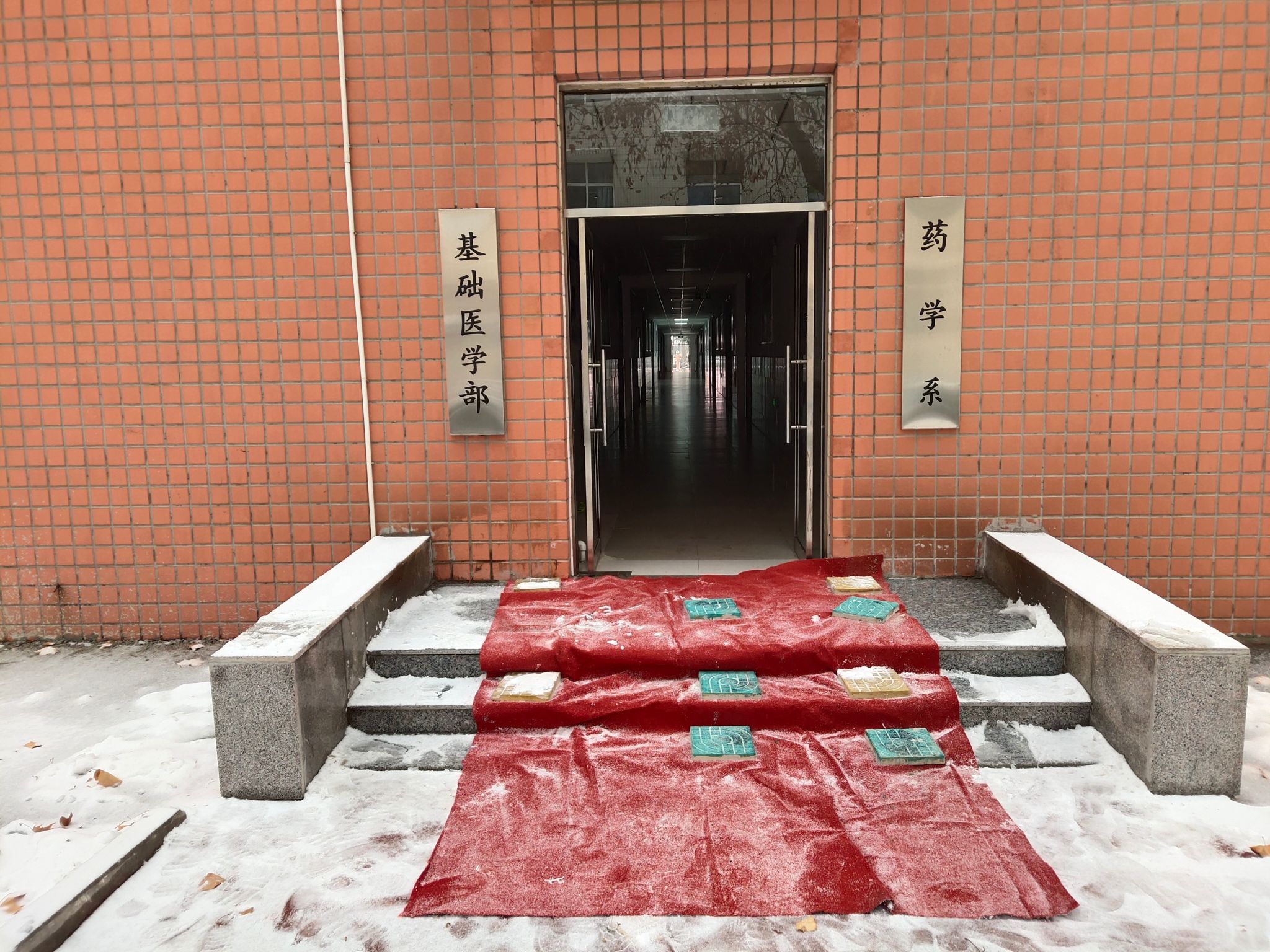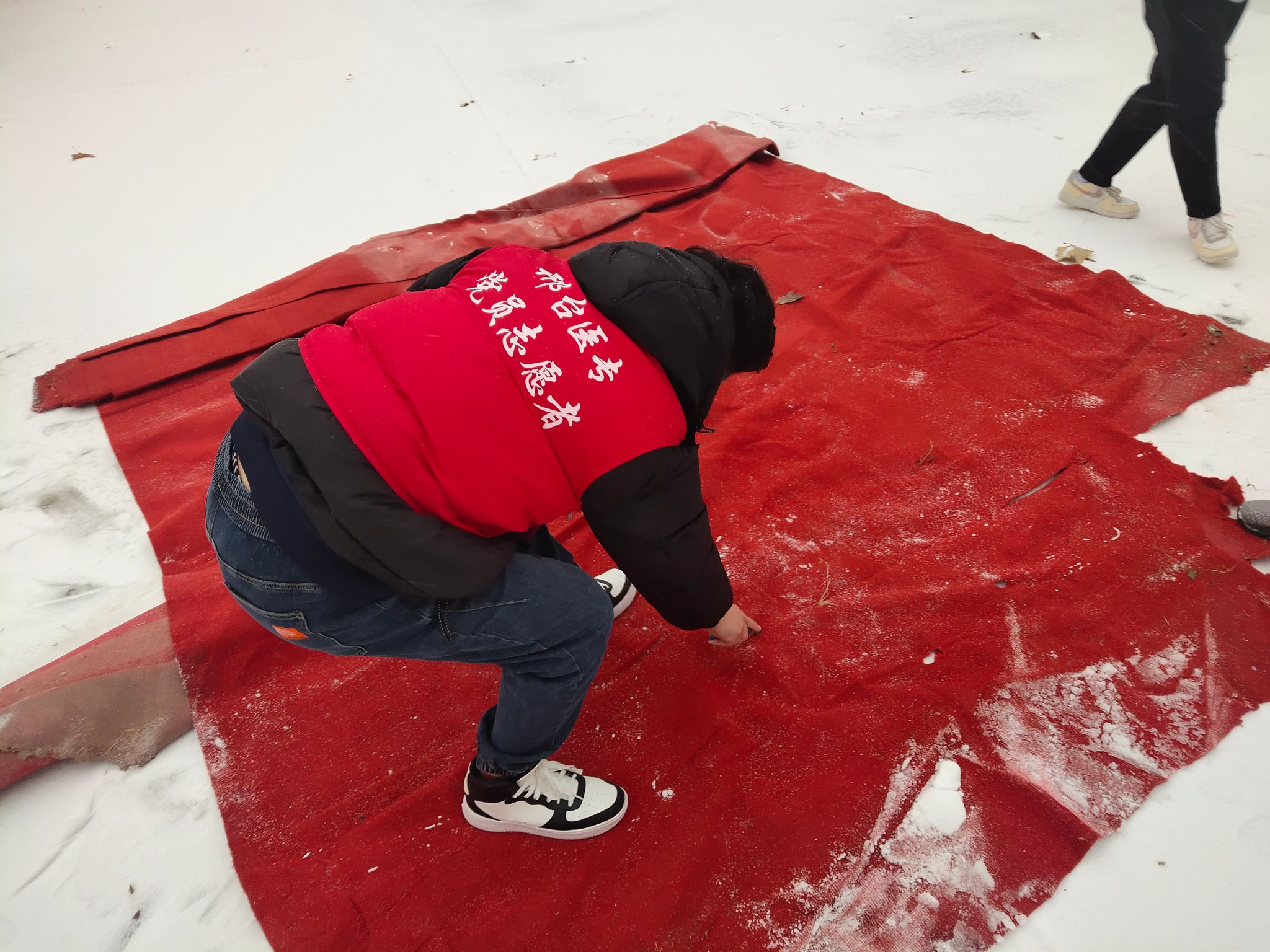 志愿者们冒着风雪将防滑毯裁成合适的尺寸,逐一铺设到教学楼、实训楼入口台阶处,为师生们铺就了一条充满温暖的安全之路。