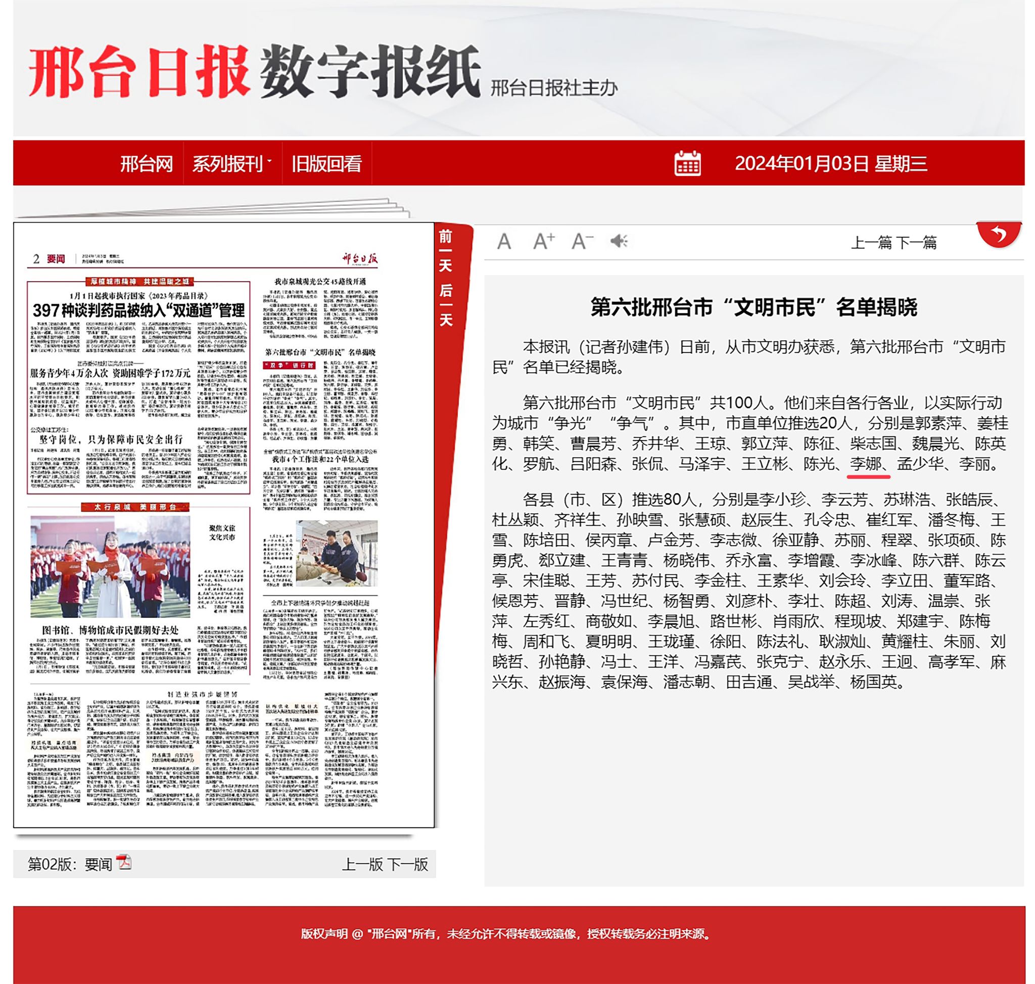 “文明市民”评选是我市深化落实“双争”活动,深入挖掘各行各业先进典型,大力培育和践行社会主义核心价值观,不断提升全市人民文明素养和社会文明程度的一项重要举措。经层层推选、严格审查及市评审委员会评审,李娜老师最终获评。