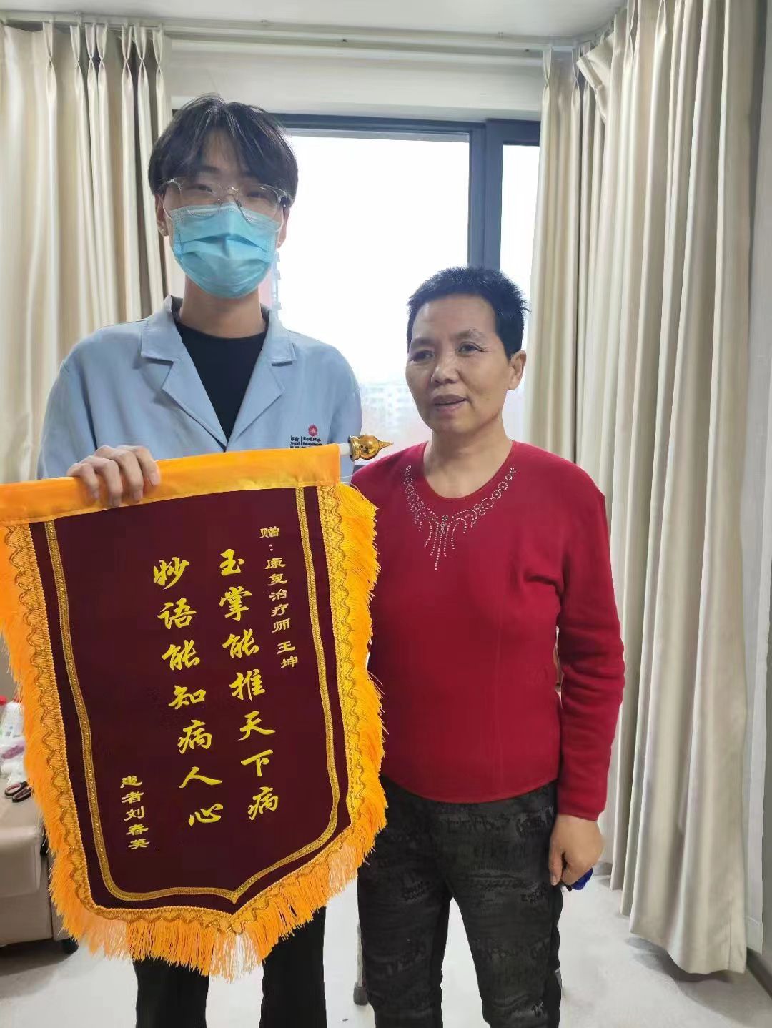 “小王大夫,太幸运能遇到像你这样有爱心的大夫,非常感谢你这段时间耐心地为我进行康复治疗,今天专门为你送锦旗来了!”患者刘春英激动地将一面写有“玉掌能推天下病,妙语能知病人心”的锦旗递到了万象城官网中医系康复专业2021级康复2班王坤同学手中。