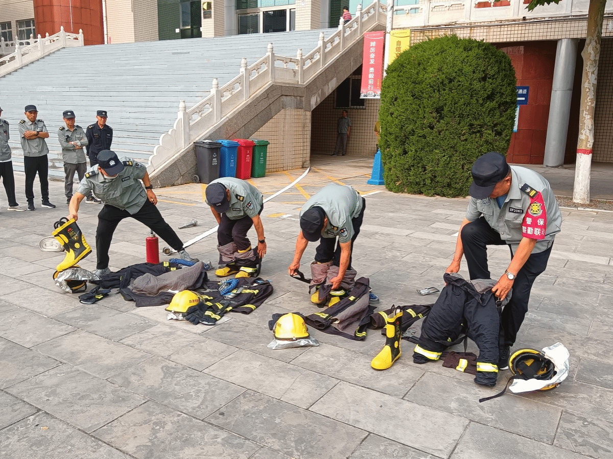 培训开始前,安全工作处负责人强调了校园消防安全工作的重要性。培训期间,校卫队队长为大家介绍了微型消防站配置的消防器材的性能参数、注意事项等内容,对消防服的穿戴、灭火器的使用、水带水枪的连接、水带的铺设、水枪的握姿等进行了演示。在校卫队队长的指导下,队员们穿上消防服、佩戴好消防头盔、铺好水带、握紧水枪进行灭火演练。