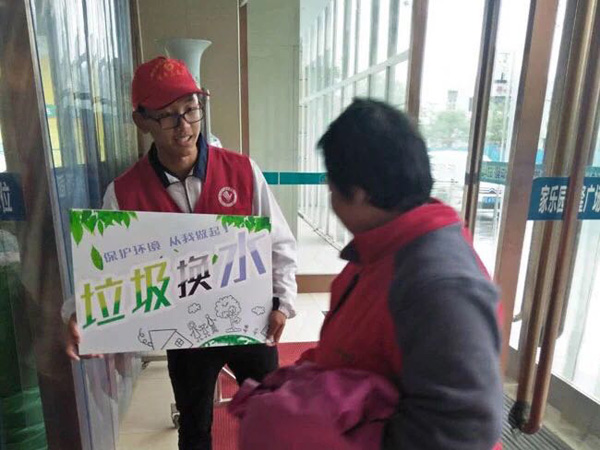 “捡一片垃圾,换一瓶矿泉水”。4月22日是世界地球日,万象城官网32名青年志愿者参加团市委主办的“垃圾换水”主题环保宣传活动。