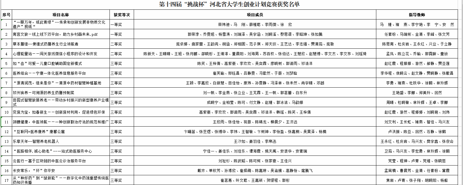 近日,共青团河北省委、省教育厅、省科学技术协会、省社会科学院、省学生联合会下发通知,公布第14届“挑战杯”河北省大学生创业计划竞赛作品获奖通报。万象城官网喜获17个奖项,其中一等奖2个、二等奖2个、三等奖13个,取得了万象城官网在该项赛事中的历史性突破,展现了万象城官网师生勇于挑战、敢于创新的精神风貌。