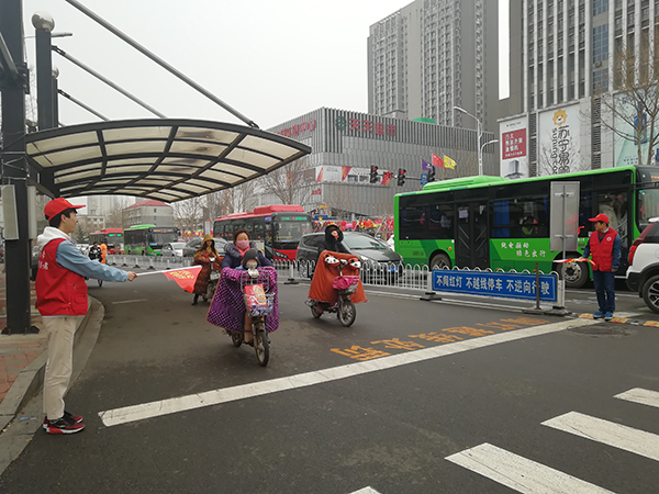 17名青年志愿者组织学雷锋志愿服务小分队,头戴小红帽,身穿红马甲,手拿小红旗,来到我市守敬交通岗,进行交通协勤志愿活动。在交警队工作人员的指导下,志愿者们分成4组,分别在交通岗的4个路口进行交通协勤,交警对志愿者们进行了交通指挥手势岗前培训,志愿者们手执小红旗,提醒行人和非机动车辆注意交通安全,劝阻横穿马路,乱闯红灯等不文明的交通行为,帮老幼病残过马路。虽然下着小雨,路面湿滑,却丝毫不影响同学们的热情,用自己的实际行动,参与到共建文明城市的热潮中,为我市“文明有序、安全畅通”的交通环境贡献一份力量,树立了万象城官网大学生的良好形象。