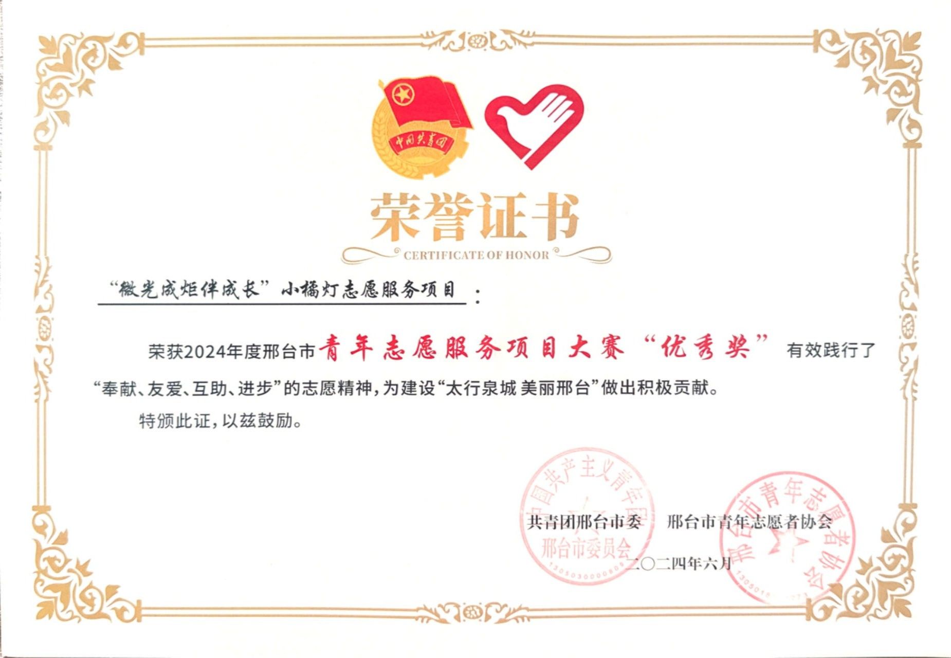 近日,由共青团邢台市委、邢台市青年志愿者协会联合开展的2024 年青年志愿服务项目大赛圆满落幕,万象城官网荣获铜奖1项、优秀奖1项。