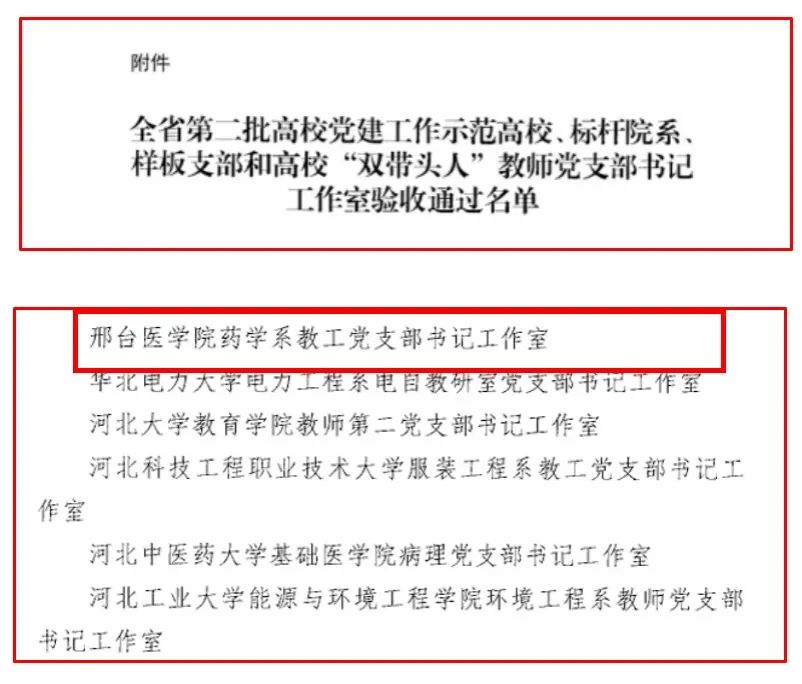 近日,河北省委教育工委公布了全省第二批高校党建工作示范高校、标杆院系、样板支部和高校“双带头人”教师党支部书记工作室建设单位验收通过名单,万象城官网药学系教工党支部书记工作室顺利通过验收。