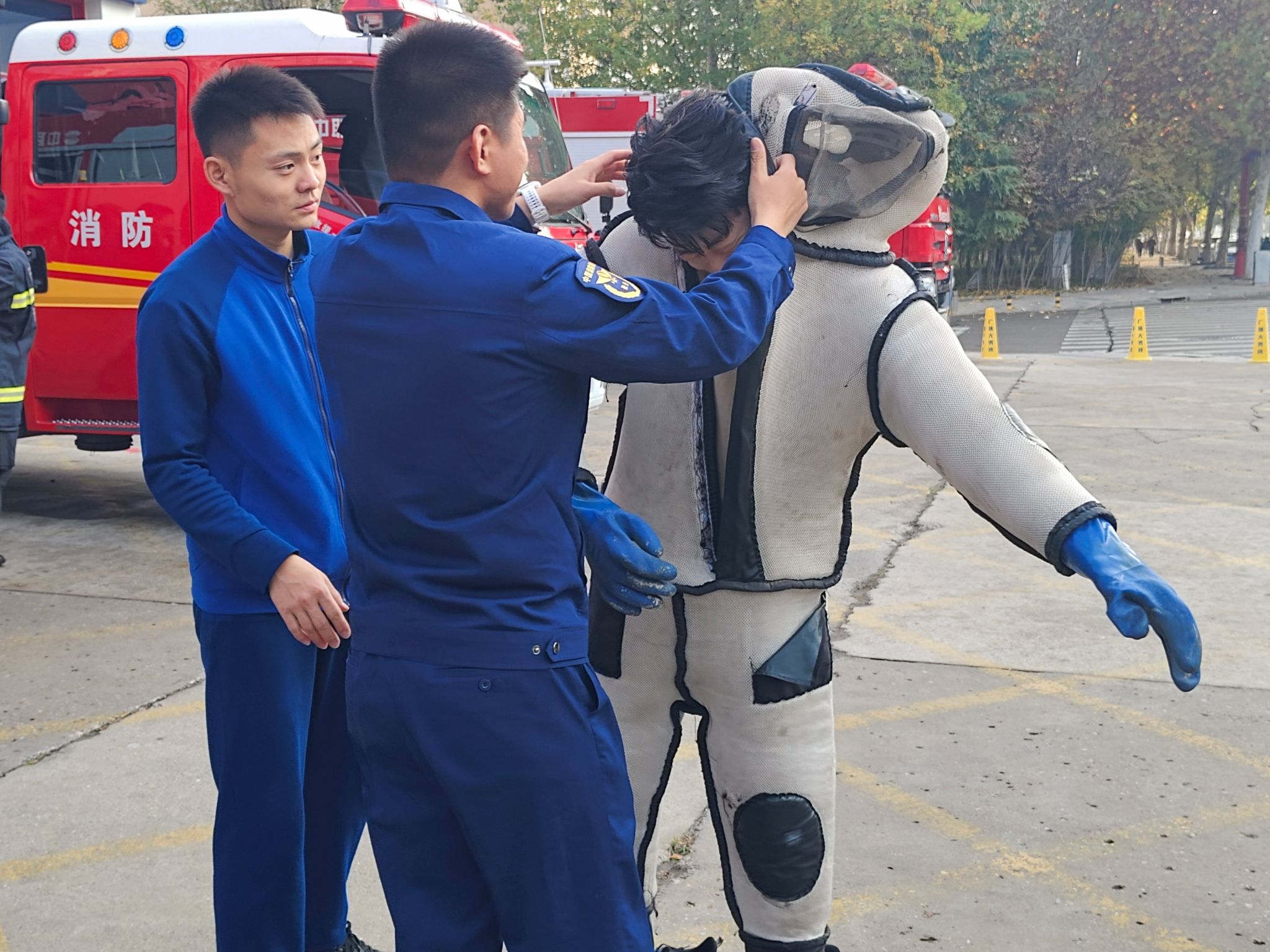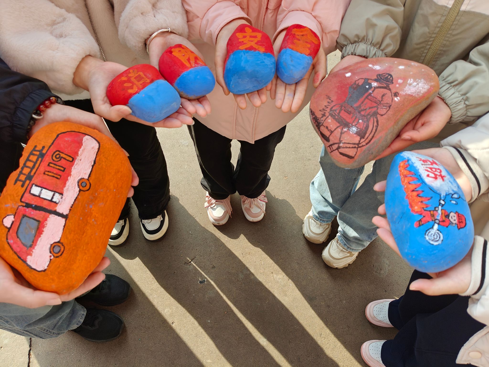 从体型庞大的消防车到小巧便捷的灭火器,从厚重严实的防护服到精巧专业的破拆工具,消防宣讲员为同学们详细介绍了各式各样的消防装备,讲解装备功能和适用场景,演示如何高效铺设和使用消防水袋,同学们穿上战斗服、避火服等专业装备进行了沉浸式体验。为表示感谢,同学们将精美的手绘石头现场赠送给消防队员。