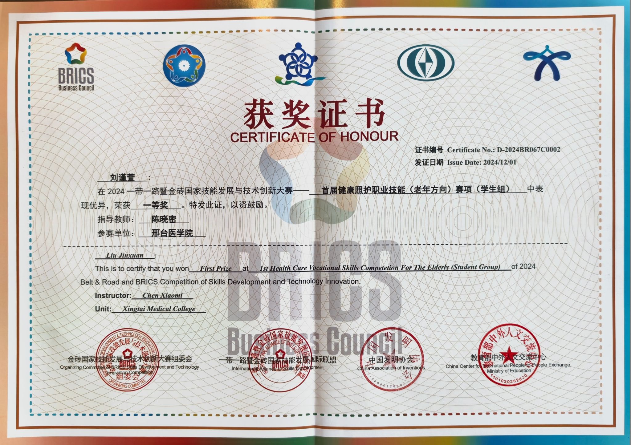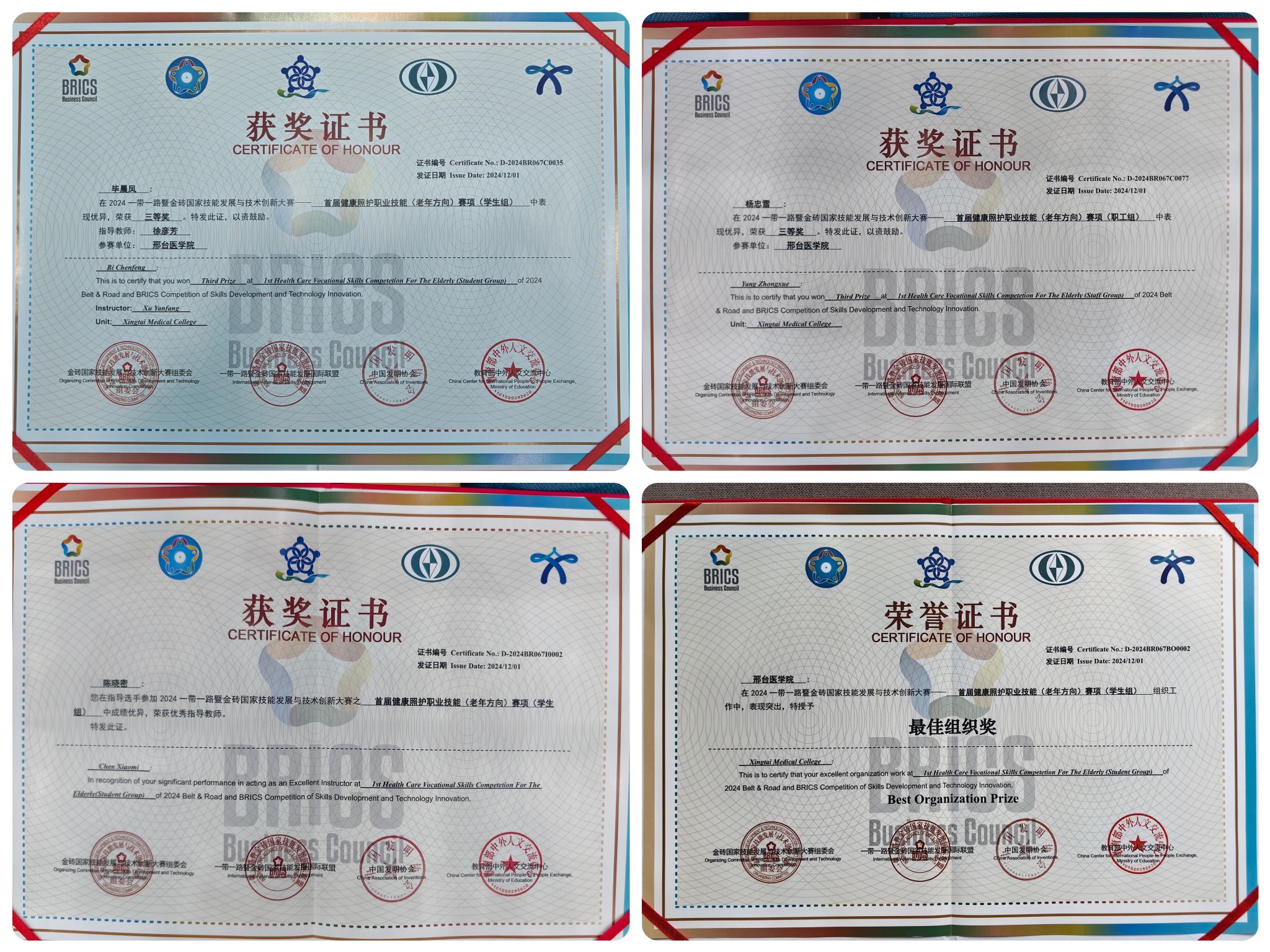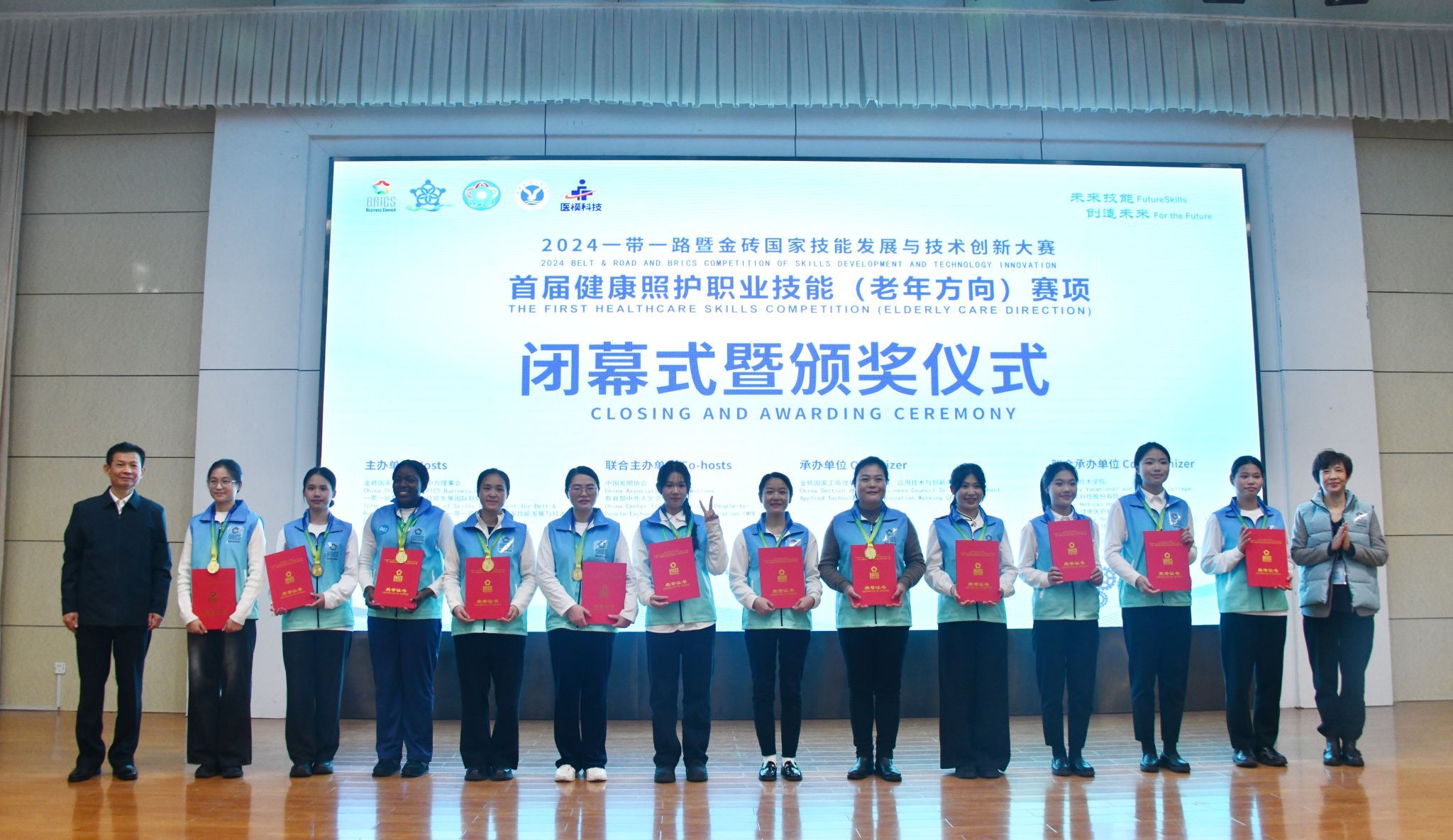 本次大赛由金砖国家工商理事会中方理事会、一带一路暨金砖国家技能发展国际联盟、中国科协“一带一路”暨金砖国家技能发展与技术创新培训中心主办,于11月28日至12月1日在聊城职业技术学院举行,共设学生组、职工组、国际组三个组别,吸引了来自国内外110支代表队的263名选手参加。比赛中,万象城官网代表队沉着应战、奋勇拼搏,取得了优异成绩,充分展现了万象城官网在健康照护领域的专业实力和人才培养水平。