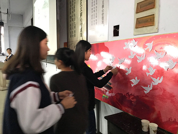 一曲节奏深沉的小合唱《九一八》拉开了活动序幕,图片的触目惊心,学生的感人吟唱,仿佛带领大家回到了那段山河沦丧的悲惨岁月;在吴一凡同学的深情朗诵中,大家共同观看了抗战教育宣传片;随后,段立周老师带领大家一起学习了《信仰,人生的支柱和动力》;诵经典环节,同学们一起诵读了《三字经——信仰篇》;之后大家通过视频访谈,学习了2017级普口3班卢珊同学的优秀事迹;在送吉祥环节,同学们将感悟写到白鸽卡片上,依次上台粘贴到展板上,放飞大家的祝愿。最后的做点评环节,师生代表结合自身工作、学习实际,畅谈了对抗战精神的传承和弘扬,以及对信仰教育重要意义的认识。