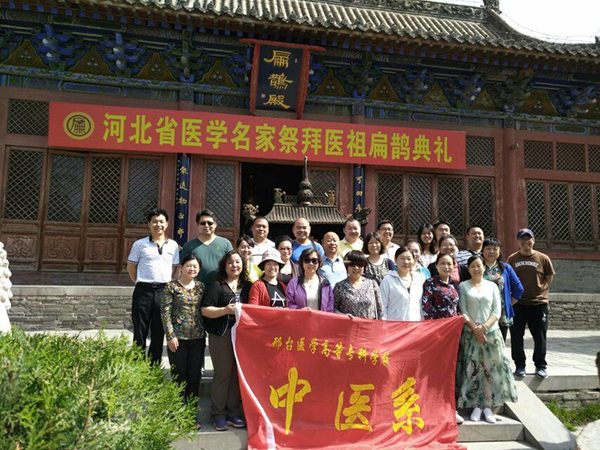 内丘县是扁鹊最主要的行医圣地,扁鹊出神入化的医术、先进的医学理念、对望闻问切尤其脉诊的发扬传承,至今对中医学的发展仍有深远的影响。在扁鹊庙祭拜现场,由内丘县中医院(扁鹊医院)副院长梁志春主持祭拜仪式,大家怀着敬仰的心情,分列恭立,齐声颂祷祭拜文“天地玄黄,华夏泱泱,赫赫医祖,诸科精良……抒发情怀,再铸岐黄”,随后向扁鹊像三鞠躬,深切缅怀这位春秋战国时期誉重当时、影响千秋的华夏中医鼻祖。老师们深刻体会到中医药的传承从未间断、中华民族文化命脉的绵延不息、中医药的历久弥新与生机勃勃。
