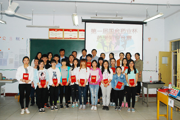 4月27日下午,由药学系主办的第一届“国金药业杯”药学知识竞赛在2016级普药班教室举行,河北国金药业有限责任公司人力资源部经理李炳佑、药学系领导、药学教研室老师以及药学专业100余名同学观看了比赛。