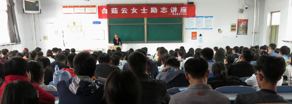 白茹云登上讲台,向同学们讲述了自己的坎坷人生,她出生在农村,身为家中大姐,酷爱读书的她很小的时候就开始帮助父母做家务、看护四个年幼的弟弟妹妹。本来家境已非常贫困,二弟8岁时又患了脑瘤,四处求医仍不见效果,落得生活不能自理;最小的三弟多年前外出打工时失踪,至今杳无音信;自己成家后,相继有了两个宝贝女儿,家庭和美,可是到了2011年,她又患上了淋巴癌……命运多舛,苍天不公,但这位年轻的农村妇女的人生梦想没有破灭,她深知自己上有老下有小,人生之路还很漫长,肩上的担子还很重。在经历了种种沉重打击后,在家人的支持下,她坚定了与疾病、与命运抗争的信心。但是治疗这样的疾病谈何容易?几年间,不仅花光了家中仅有的一点积蓄,还欠下了亲戚朋友数万元的债。每次到石家庄进行化疗,为了节省费用,她都是一个人去,不让家人陪护,路上为省下24元路费,她早晨5点起床,中途5次倒车,花5个小时才能到达治病的河北医科大学第四医院。在化疗期间,即使无法正常干活种田,不能照顾自己的家庭,她也不让自己的时间荒废一天。在病床上她通过研读诗词来减轻病痛,调节心情,丰富生活;一个疗程刚刚做完,她拖着虚弱的身子帮别人扎塑料花来补贴家用。2014年12月,大病未愈的她,克服重重困难,首次报名参加了河北电视台的《中华好诗词》节目,她不负众望,连闯三关;2016年7月,她写的《蝶恋花》在《中华好诗词》微信公众号评比中,获得三等奖;2017年2月,在央视举办的《中国诗词大会》上,这位貌不惊人、身患淋巴癌、家境贫寒的农民妇女以答对全部选题、获得285分的出色表现,走进了亿万观众的心里;2017年4月初她光荣当选了邢台市政协委员。