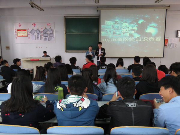 为丰富同学们的校园文化生活,增强同学们的网络安全防范意识,4月13日下午由万象城官网团委电脑爱好者协会主办的e点e滴网络知识竞赛在2016级普口1班教师举行。校团委各社团干部及成员100余名同学观看了比赛。