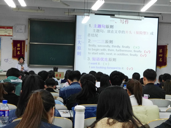 王月贞主任首先对同学们的学习积极性给予了肯定,并希望同学们通过坚持不懈地学习顺利地通过考试,为日后步入工作岗位打下良好的基础。讲座中,王主任以英语四级为例,详细分析了考试的具体题型以及各题型所占的分值比例,并逐一讲解了写作、听力、阅读、翻译四大部分的应试策略。“主题句原则、短语优先原则……”讲座中同学们认真记录着王主任总结归纳的应试策略,纷纷表示听完此次讲座后受益匪浅。